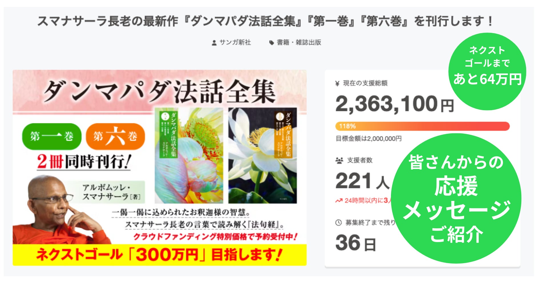 スマナサーラ長老の最新作『ダンマパダ法話全集』『第一巻』『第六巻』の刊行をめざすクラウドファンディングは、開始から1週間となる5月24日までに、236万円&221名のご支援をいただいております。