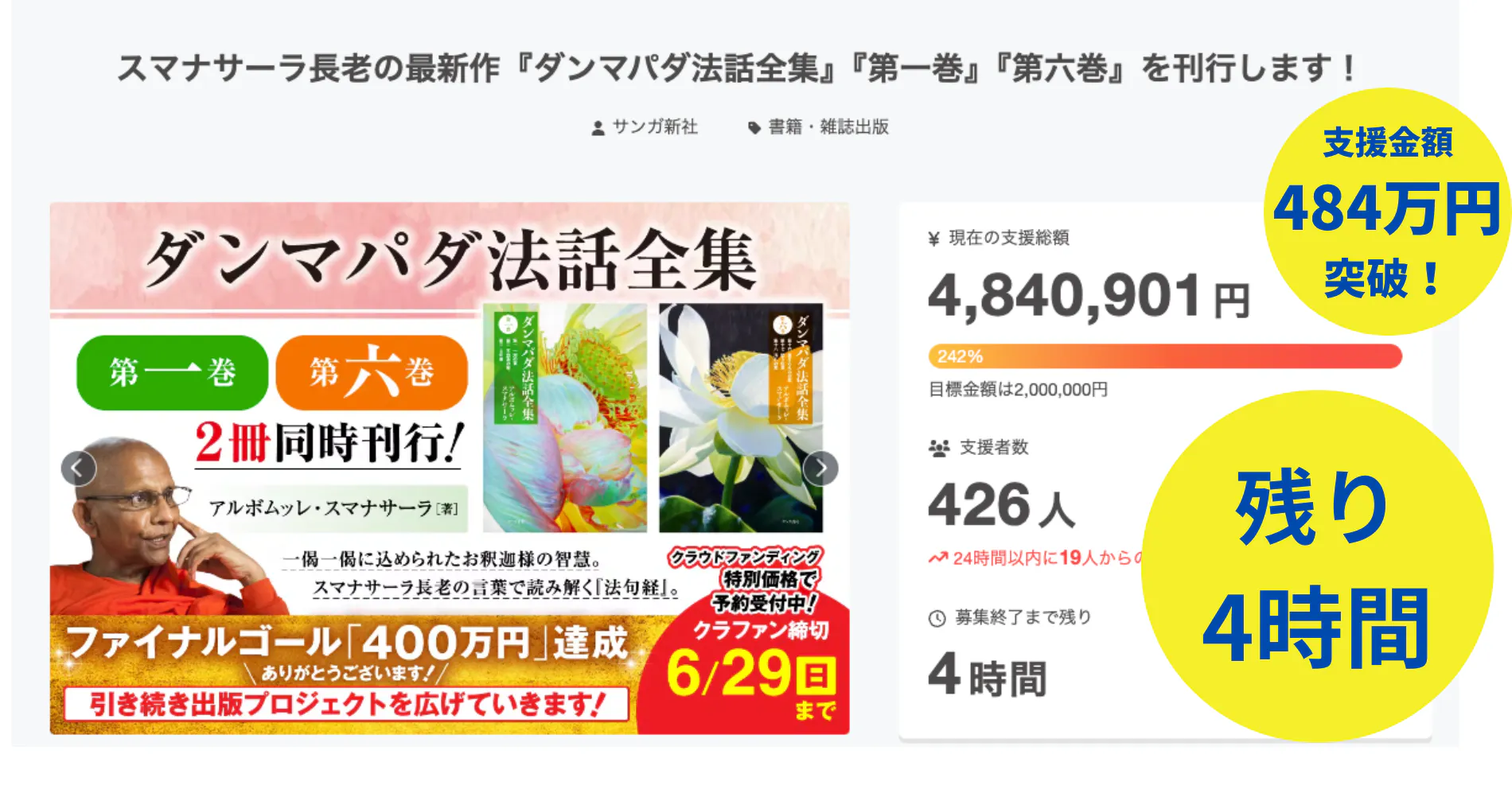 「スマナサーラ長老の最新作『ダンマパダ法話全集』『第一巻』『第六巻』を刊行します!」クラウドファンディングは、当初の目標200万円を達成後、ネクストゴール300万円、さらにファイナルゴールの400万円も突破し、現在、最後のご支援のお願いをしています。