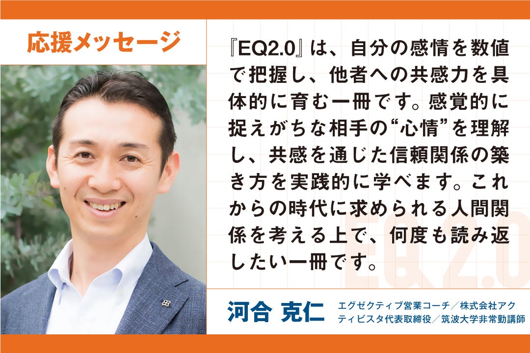 書籍『EQ2.0』1冊(2,420円/送料無料)と河合克仁氏による営業オンラインセミナー1回(定価6,500円を6,080円にて)がセットになったお得なコースです。