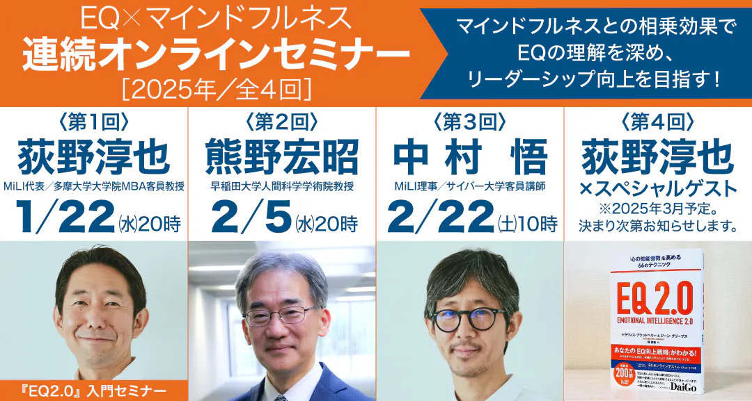 そこで今回、『EQ2.0』をテキストに、EQとマインドフルネスを実践的に学べるセミナーも開催します。日本のEQ・マインドフルネス分野のスペシャリストから貴重な学びをご提供いただきます。