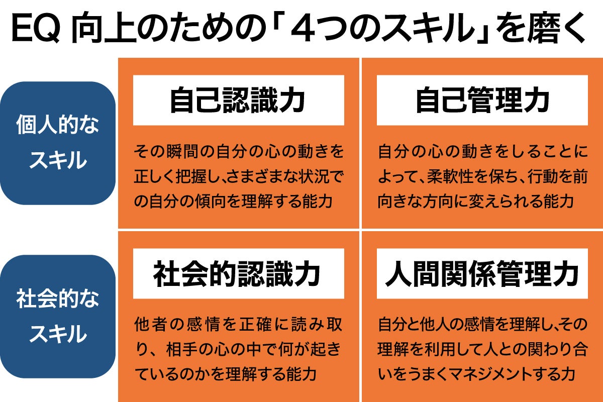 EQ向上の鍵となるのは「自己認識力」「自己管理力」「社会的認識力」「人間関係管理力」という4つのスキルです。