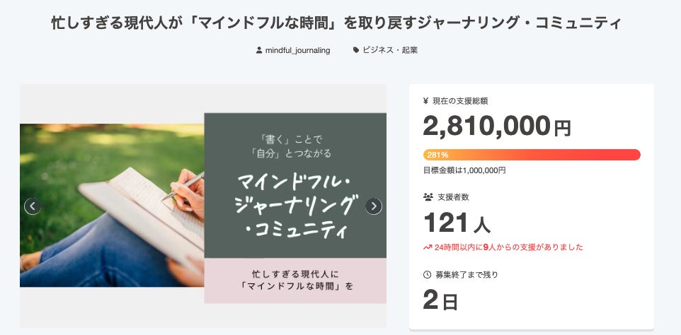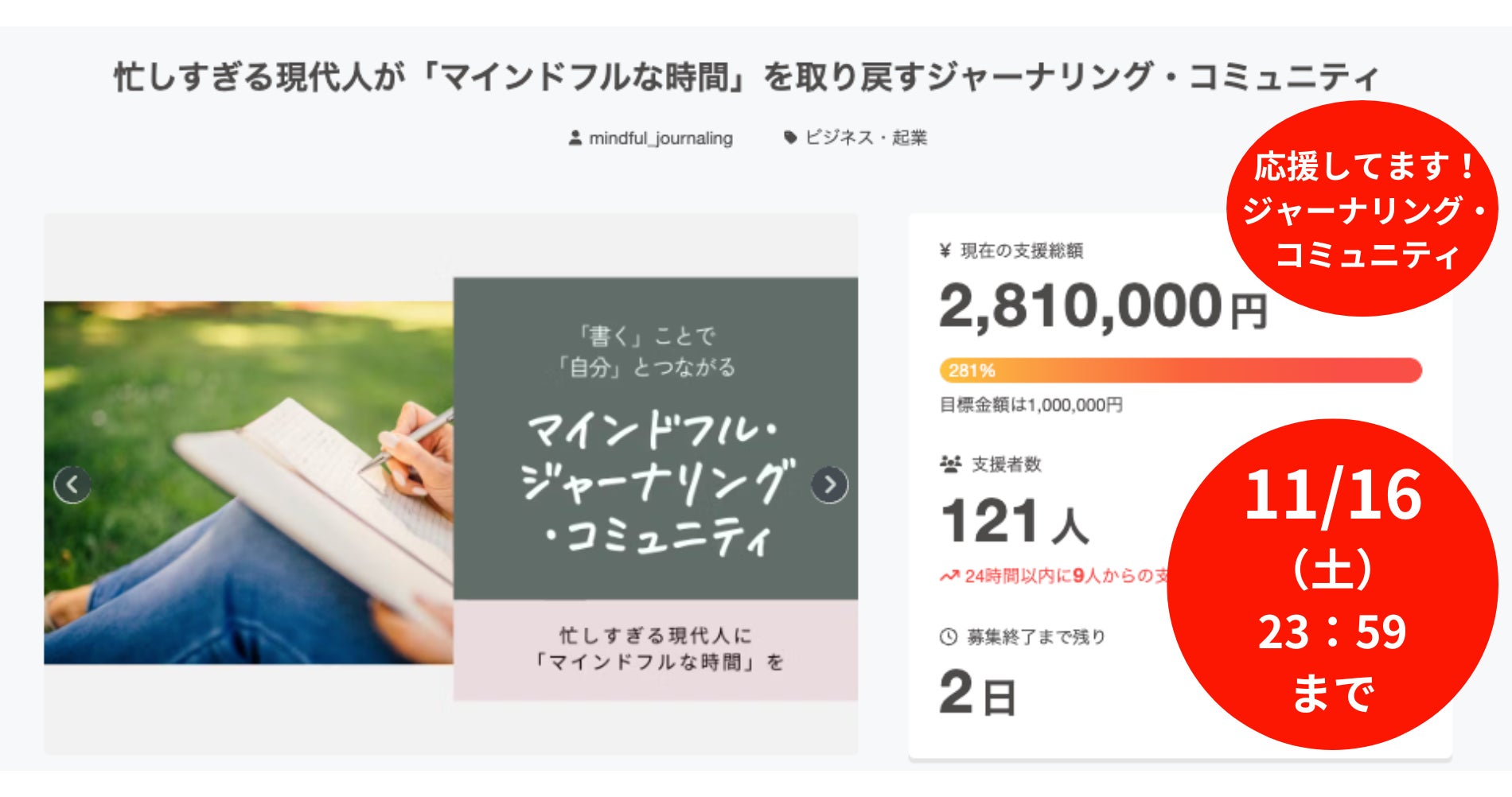 荻野淳也さんや中村悟さんたちが実施する「忙しすぎる現代人が「マインドフルな時間」を取り戻すジャーナリング・コミュニティ」クラウドファンディングは「11月16日(土)23:59」までです。