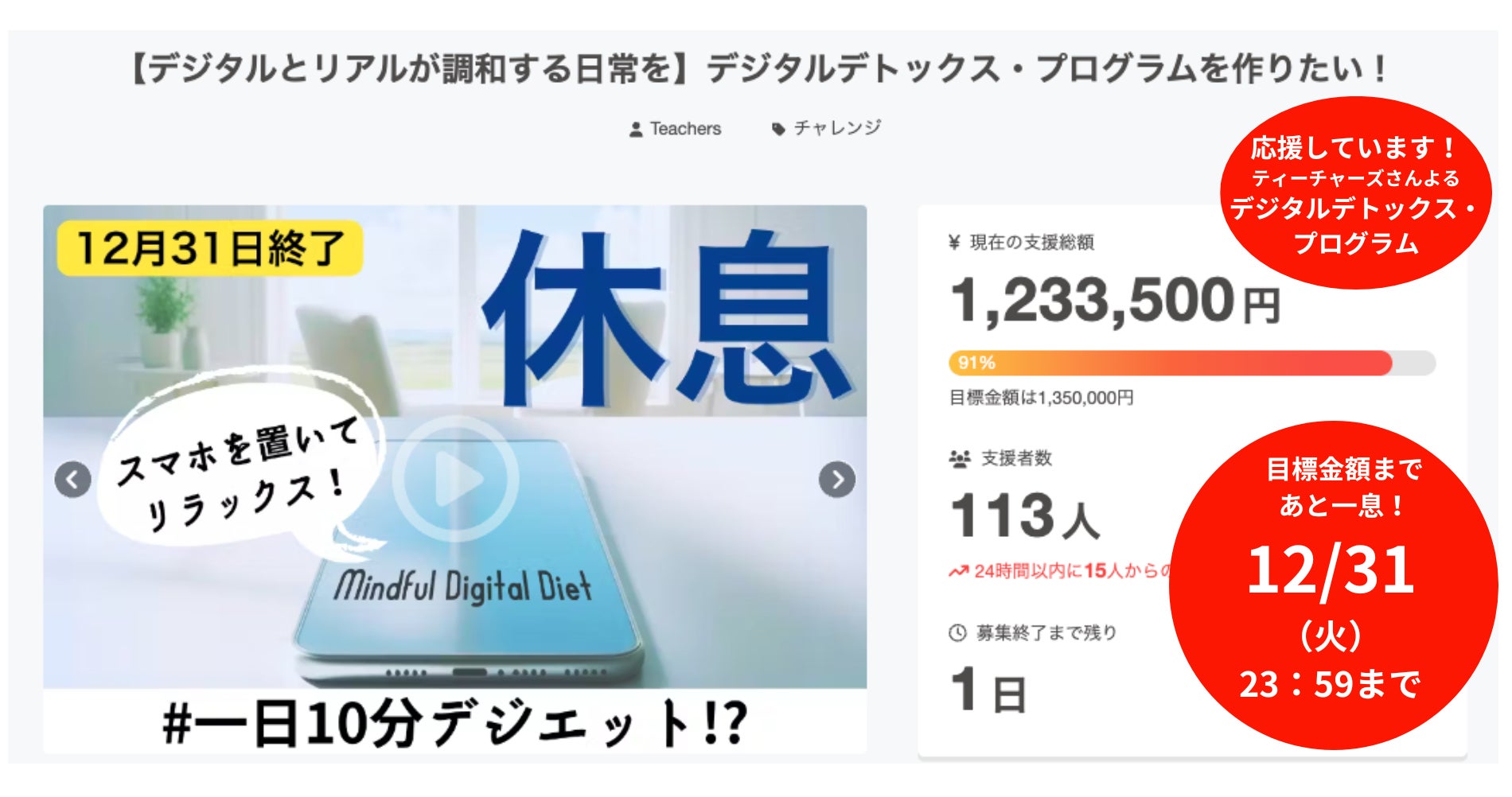 ティーチャーズさんが手掛ける「【デジタルとリアルが調和する日常を】デジタルデトックス・プログラムを作りたい!」プロジェクトのクラウドファンディングは、「12月31日(火)23:59」までです。