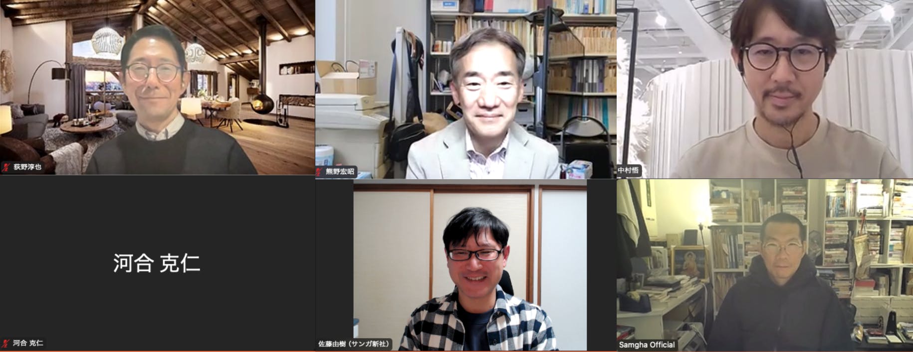 先日、オンラインセミナーの講師の先生方、熊野宏昭先生、荻野淳也先生、中村悟先生、河合克仁先生、そしてサンガ新社の佐藤と川島が集まり、1月22日からスタートするセミナーの内容について、オンラインで打ち合わせをしました。