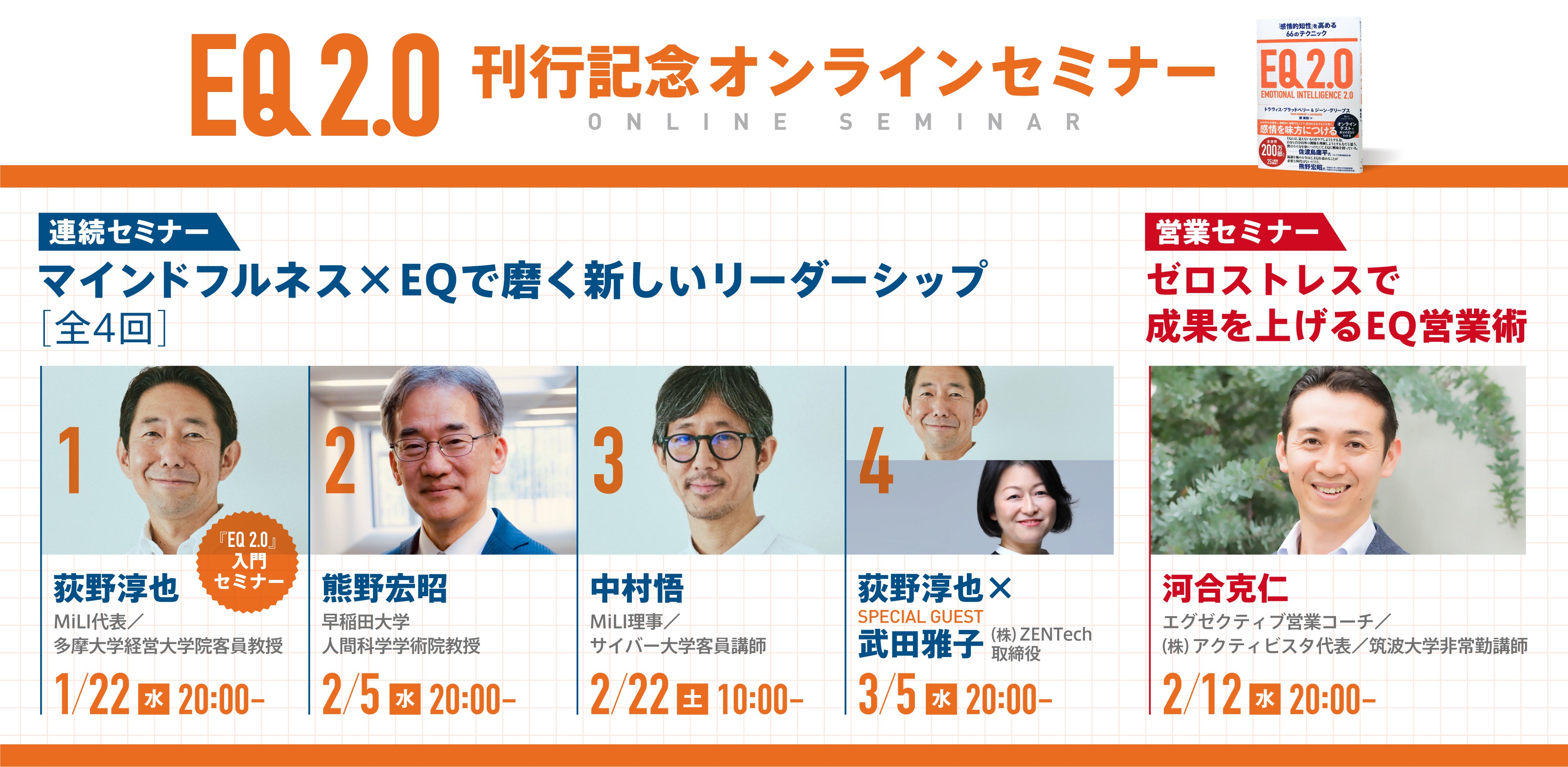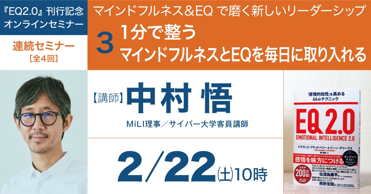 中村悟先生にご登壇いただく『EQ2.0』オンラインセミナーは2月22日(土)10時開催です。土曜日の午前のひととき、どうぞお気軽にお申し込みください。