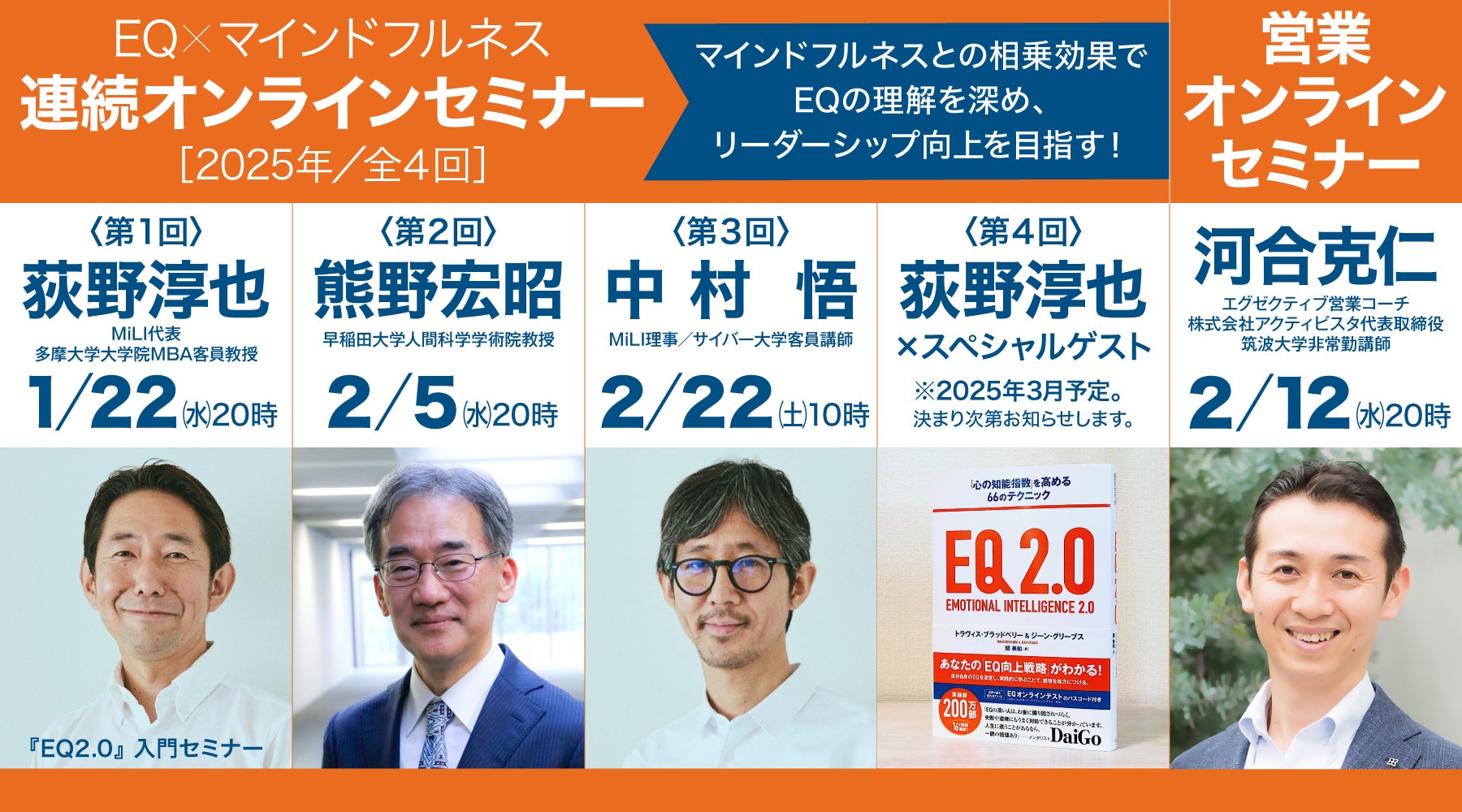 オンラインセミナーを通してEQを身につけるクラウドファンディング「『EQ2.0』とセミナーで「感情的知性」を磨き、あなたのビジネスと人生を豊かに!」は、残すところあと5時間となりました。リターンでは「入門オンラインセミナー(全1回)」「連続オンラインセミナー(全4回)」「営業オンラインセミナー(全1回)」をご用意していますので、あらためてまとめてご案内いたします!入門オンラインセミナー(全1回) & 連続オンラインセミナー(全4回)熊野宏昭先生、荻野淳也先生、中村悟先生の3名を講師として迎え、入門オンラインセミナー(第1回)と3つのセミナーを組み合わせた、EQの理解を深めるプログラムです。【第1回】<◎入門セミナーを兼ねて開催>2025年1月22日(水)20時[講師]荻野淳也(MiLI代表/多摩大学経営大学院客員教授/慶應義塾大学大学院理工学研究科非常勤講師)『EQ2.0』を活用して感情的知性アップを目指す荻野淳也氏による『EQ2.0』入門オンラインセミナーを開催します。『EQ2.0』のオンラインテストの受け方や効果的な活用法にはいくつかのポイントがあり、この入門セミナーでそれらを学ぶことで、より有効に『EQ2.0』を活用することができます。【第2回】2025年2月5日(水)20時[講師]熊野宏昭(早稲田大学人間科学学術院教授/早稲田大学応用脳科学研究所所長)マインドフルネスとEQで心の平穏と共感を育てる混迷を極める現代社会で、心の平穏と創造性を育むマインドフルネスとEQ(感情的知性)は、ますます重要なスキルとなっています。本セミナーでは、第一人者である熊野宏昭先生によるセッションを通じて、心のストレスを例に挙げながら、マインドフルネスの全体像と実践方法を学びます。熊野宏昭先生は、「マインドフルネスとEQは、別の国で育った兄弟のようなものです」とおっしゃいます。呼吸と感情の関係に注目し、自己管理能力を高め、他者との共感を深める技術を探ります。今こそ必要なEQの力を活用し、自己と他者を理解しながら前向きな変化を生み出す方法を一緒に学びましょう。【第3回】2025年2月22日(土)10時[講師]中村悟(MiLI理事/サイバー大学客員講師)1分で整う 日々の実践でマインドフルネスとEQを育む中村悟先生が、日常の中でマインドフルネスとEQを育むための実践的な方法をお伝えします。このセミナーでは、短時間で取り組める具体的なエクササイズを紹介し、忙しい日常でも無理なく続けられるマインドフルネスの実践を提案します。さらに、EQは計測できるものだからこそ、マネジメントが可能になります。EQをお手軽に計測できるツールとして、『EQ 2.0』にはオンラインテストのパスコードも付属していますので、中村先生とともにその活用法を教えていただきます。【第4回】(※開催日時は2025年3月予定。決まり次第お知らせします)[講師]荻野淳也 × スペシャルゲストマインドフルネスとEQがもたらす人生の変革荻野淳也先生をホストとして、スペシャルゲストをお迎えし、マインドフルネスとEQが人生にどのような変革をもたらすかを議論します。特に、自分自身への気づきとウェルビーイングの向上がどのようにリーダーシップに結びつくかに焦点を当て、内面の成長やリーダーとしての自己認識力、他者との共感を深める方法を探ります。営業オンラインセミナー(全1回)2025年2月12日(水)20時[講師]河合克仁(エグゼクティブ営業コーチ/株式会社アクティビスタ代表取締役/筑波大学非常勤講師)ストレスを減らし、信頼を築く営業術河合克仁先生は、営業の現場で実績を積み上げながら、心の成長とEQ(感情的知性)の重要性を実感され、体系化して伝えてくださる実践者です。このセミナーでは、営業におけるEQの活用をテーマに、顧客の感情やニーズに寄り添い、信頼関係を築くためのアプローチが紹介されます。EQを活かすことで、顧客の本質的なニーズを深く理解し、自然と成約に繋がる提案が可能になります。河合氏独自の「ストレスを減らし、信頼を築く営業術」を学び、効果的で満足度の高い営業を実現するヒントを得られる貴重な機会です。お申し込みは「11月30日(土)23:59」まで!入門オンラインセミナー、連続オンラインセミナー、営業オンラインセミナーを組み合わせを受講することもできますので、どうぞお好みのリターンをお選びください。お申し込みをお待ちしております。