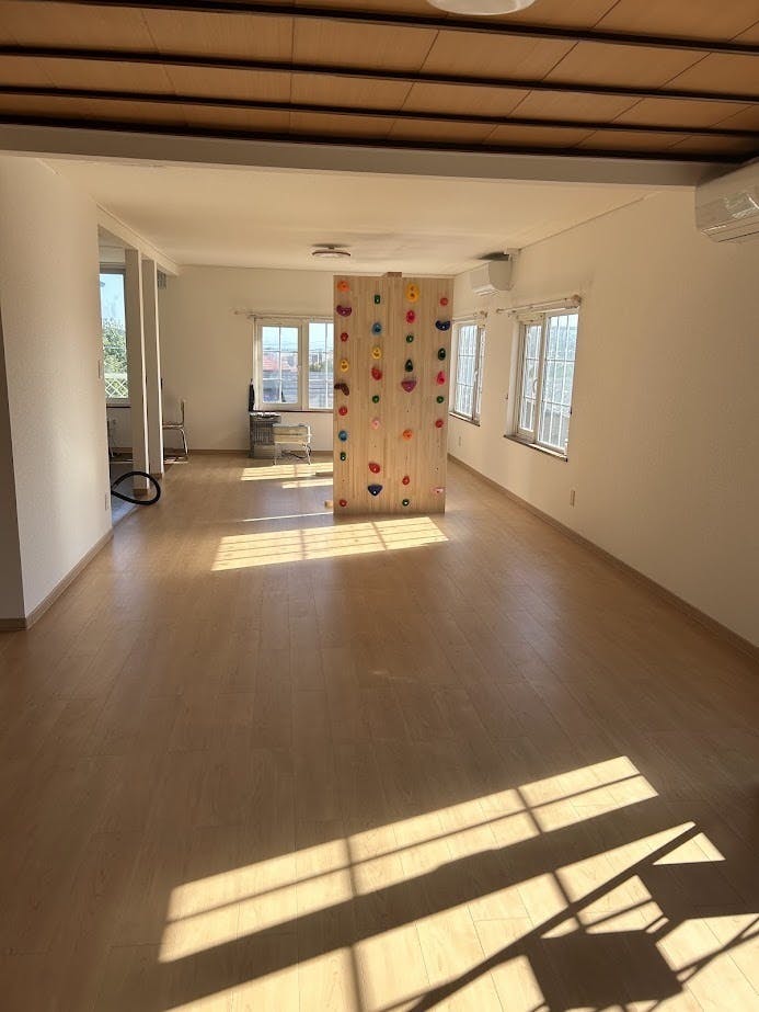 現在、クルハウスの2階は、子どもたちがもっと楽しく、安心して過ごせる空間にリフォーム中です。この写真にあるクライミングウォールも設置予定で、完成すれば、遊びながら運動能力やバランス感覚を育てることができる魅力的なアクティビティエリアになります