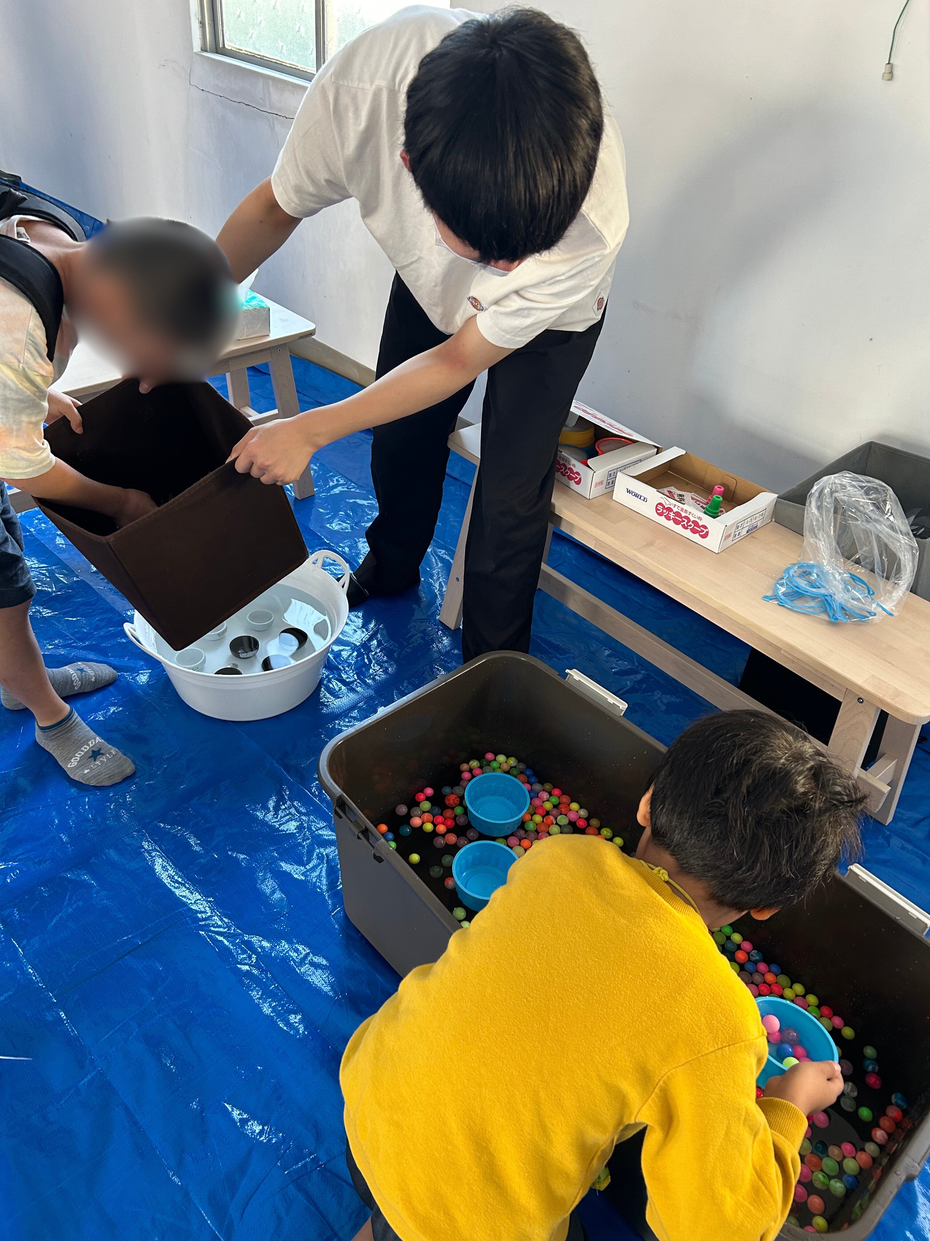 特に、写真の中で黄色い服を着た男の子は、夢中になってたくさんのスーパーボールをすくおうと頑張っていました。彼の表情には、真剣さと楽しさが混じり合い、ボールをすくうたびに「やった!」と喜ぶ声が聞こえてきました。一緒に参加している友達やスタッフも、「もう少し右!」「すごい、上手だね!」と声をかけながら応援してくれていて、温かい雰囲気の中でゲームが進行していました。