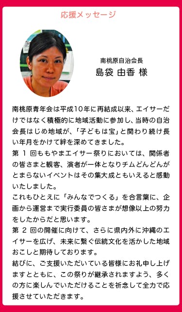 つきましては誠に恐縮ではございますが、ももやまエイサー祭りの趣旨をご理解いただき、皆様のご支援、応援を賜りたくここにお願い申し上げる次第でございます。よろしくお願いいたします。