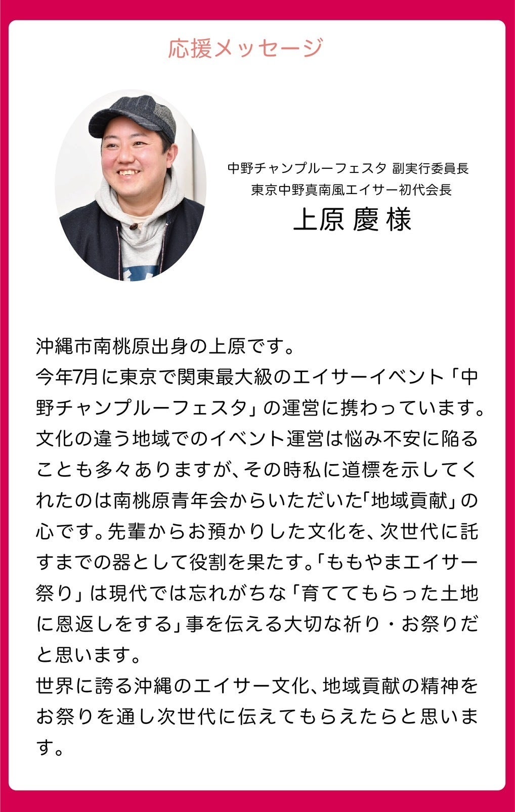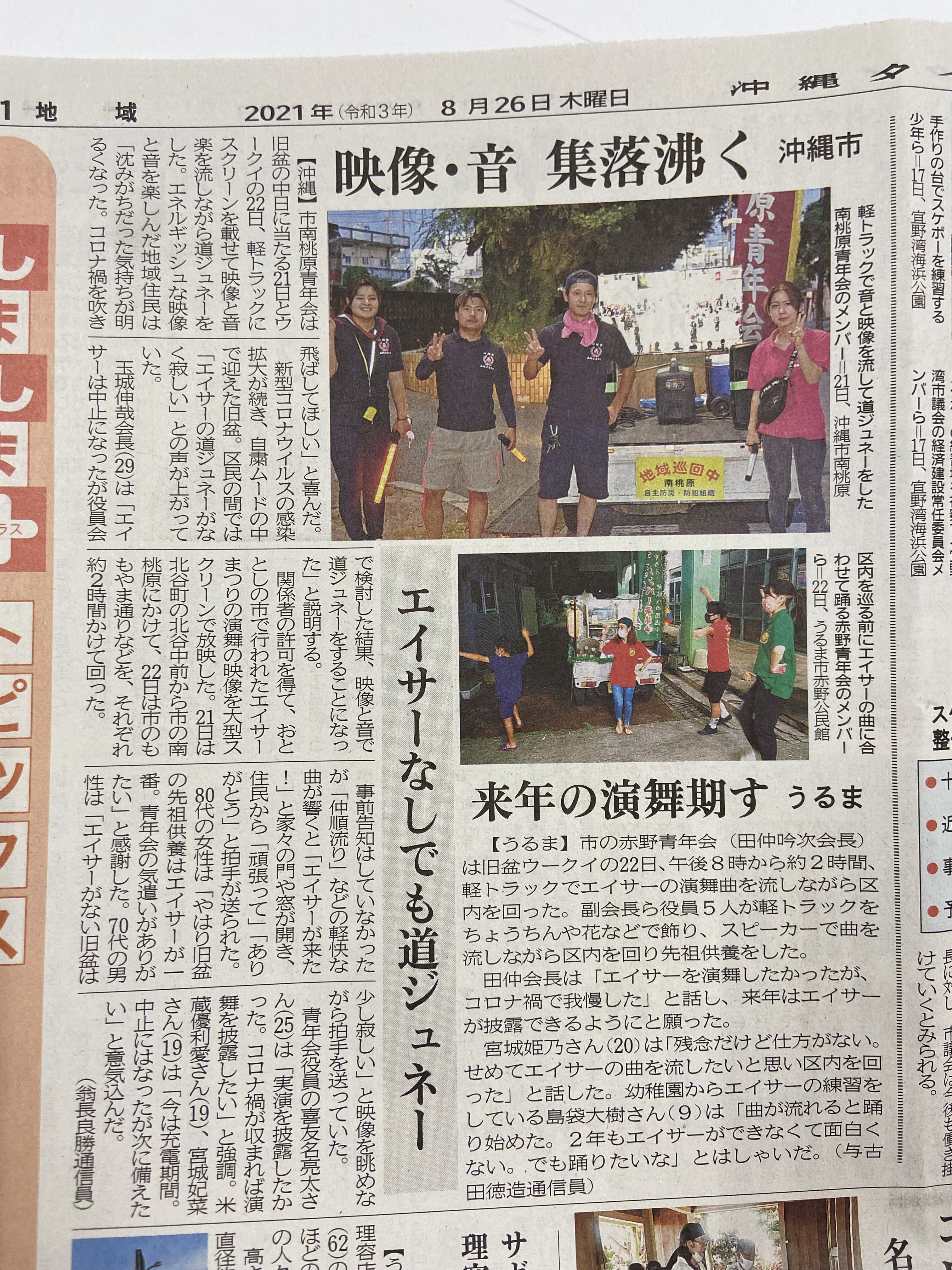そんなコロナ禍の真っ只中、6代目会長に就任しました。そこでの想いはただ1つ『青年会を絶対に潰さず、再開した時にはみんなが楽しい青年会を作り、今まで以上に盛り上げる』-----続き-----ですが活動出来ない事は変わらず旧盆の決断をしないといけない時期になって来た時公民館にて自治会長から地域の声を聞かされました。『お盆にエイサーないのは寂しいねー』『道じゅねーは今年は回るの?』など色々な問い合わせやご意見を頂いており普段通りの道じゅねーは出来ないが何か出来ないかと自治会と相談していきました。そこで、軽トラックに音響を載せて回るよーと他の青年会から情報がありせっかくなら他がやっていない事をしようと思いモニターテレビと音響で道じゅねーする事になりました。映像はYouTubeに投稿している方から許可を頂きナカビ、ウークイと2日かけて南桃原地域を回りました!YouTubeの音源なので太鼓や指笛などの音もあり実際にやっていると勘違いさせてしまう事もありましたが地域の住民の方々からは『こういう形でもやってくれてありがとう』『やっぱりお盆にはエイサーないとねー』『来年は是非いつも通りやって欲しい』など嬉しい声を掛けて頂きやって良かった!と心から思えましたその年はその1回のみの活動で終了しました。翌年2022年には練習を開始する事が出来ましたがやはり2年のブランクはかなりキツくメンバーを集める事がとても大変でした。色々祭りも開催される様になり、3年ぶりに旧盆道じゅねーを実施致しました。とても多くの地域の方や遠方からの観覧者が来て頂き、楽しく4日間を終えました!