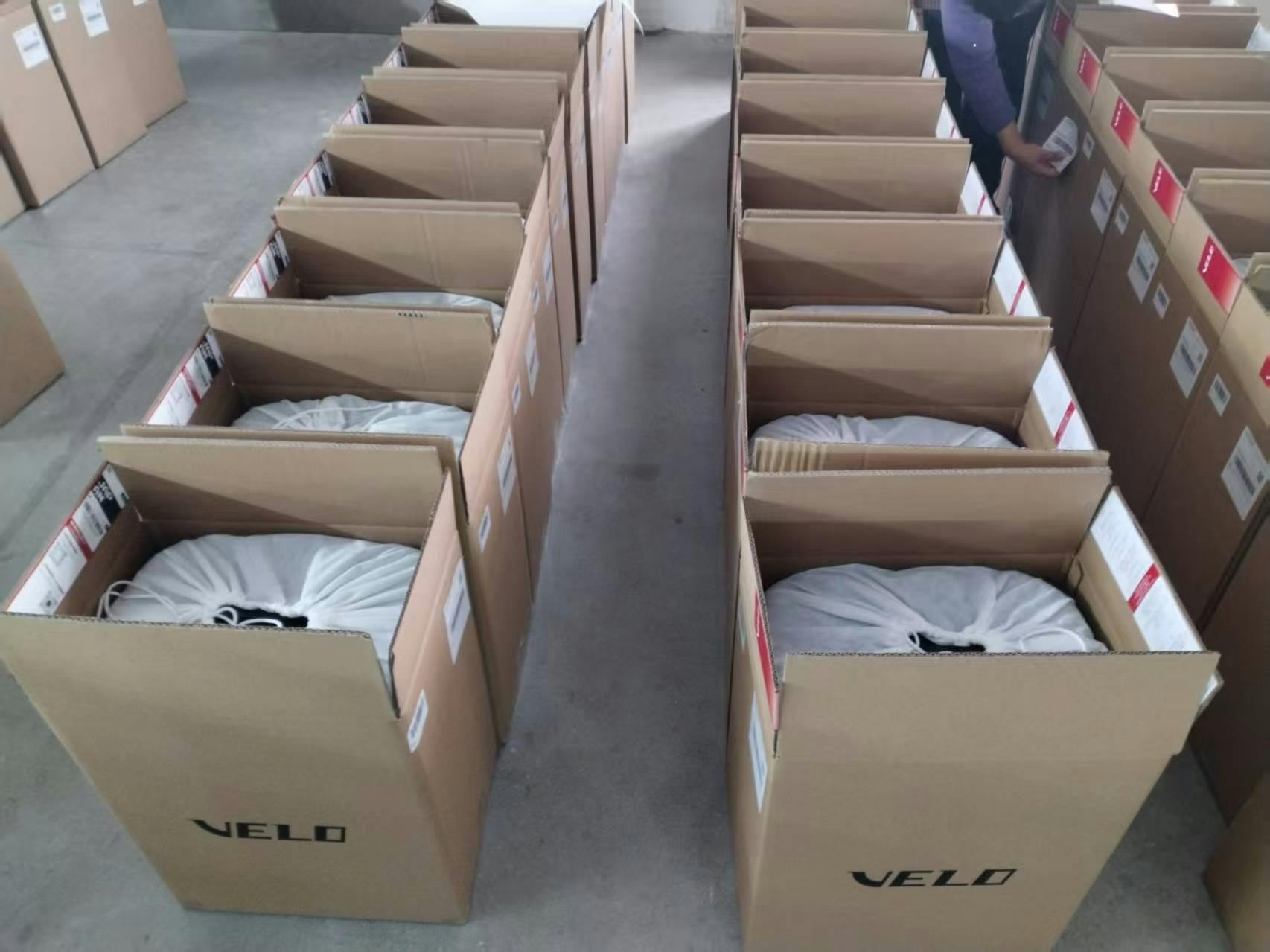 工場より、VELOの「初回生産分」の製造・検品・梱包がすべて完了したとの報告が入りました! まずは、出荷待ちの山積みになったVELOをご覧ください。