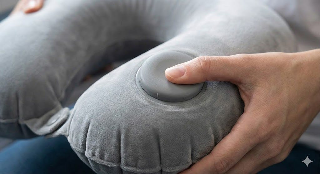 1. 【衛生的&スマート】指で押すだけ!口をつけずに30秒で完成本体に内蔵された大きな「丸型ポンプ」を指でプッシュするだけで、みるみる空気が入ります。 口を一切つける必要がないため、非常に衛生的。空港のロビーや機内でも、人目を気にせずスマートに準備が整います。