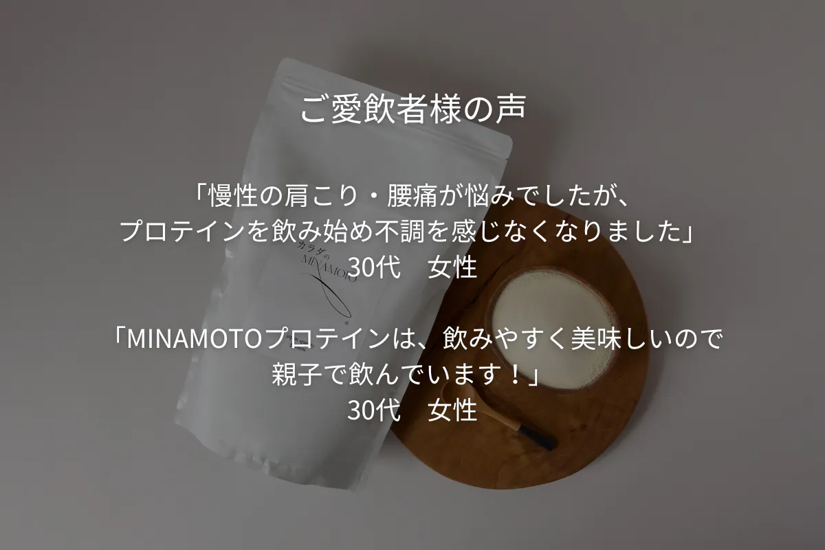 これまで私自身も美容グッズやサプリメントなど様々な商品を試してきましたが「MINAMOTOプロテイン」と出会い、体づくりのベースである「タンパク質」の効果や重要性を認識できたのは、エステティシャンとして、一人の女性として、また母親としても大きな財産だと思っています。