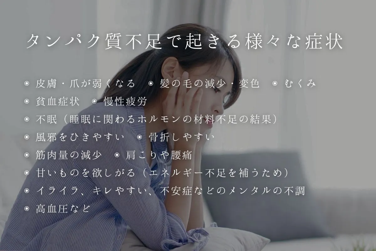 身体を作るタンパク質が不足すると、髪や肌、爪のトラブルだけでなく、太りやすくなったり、冷え、不妊などにもつながります。