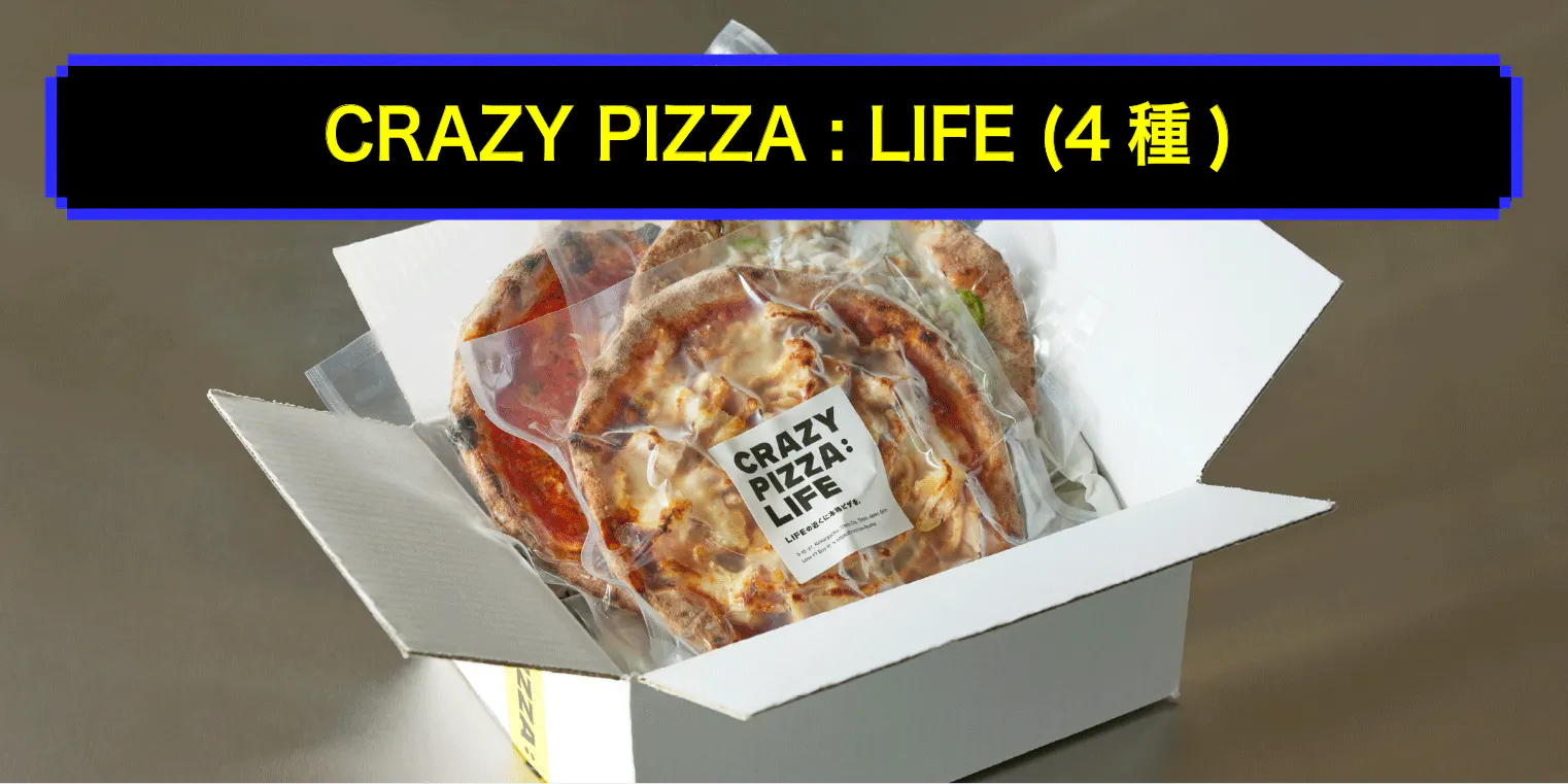 ミシュランに掲載された大人気の「CRAZY PIZZA : LIFE」から4種類 (マルゲリータ、ジェノベーゼ、クワトロフォルマッジ、えびグラタン)のピザを冷凍便で当社からお届けします。
