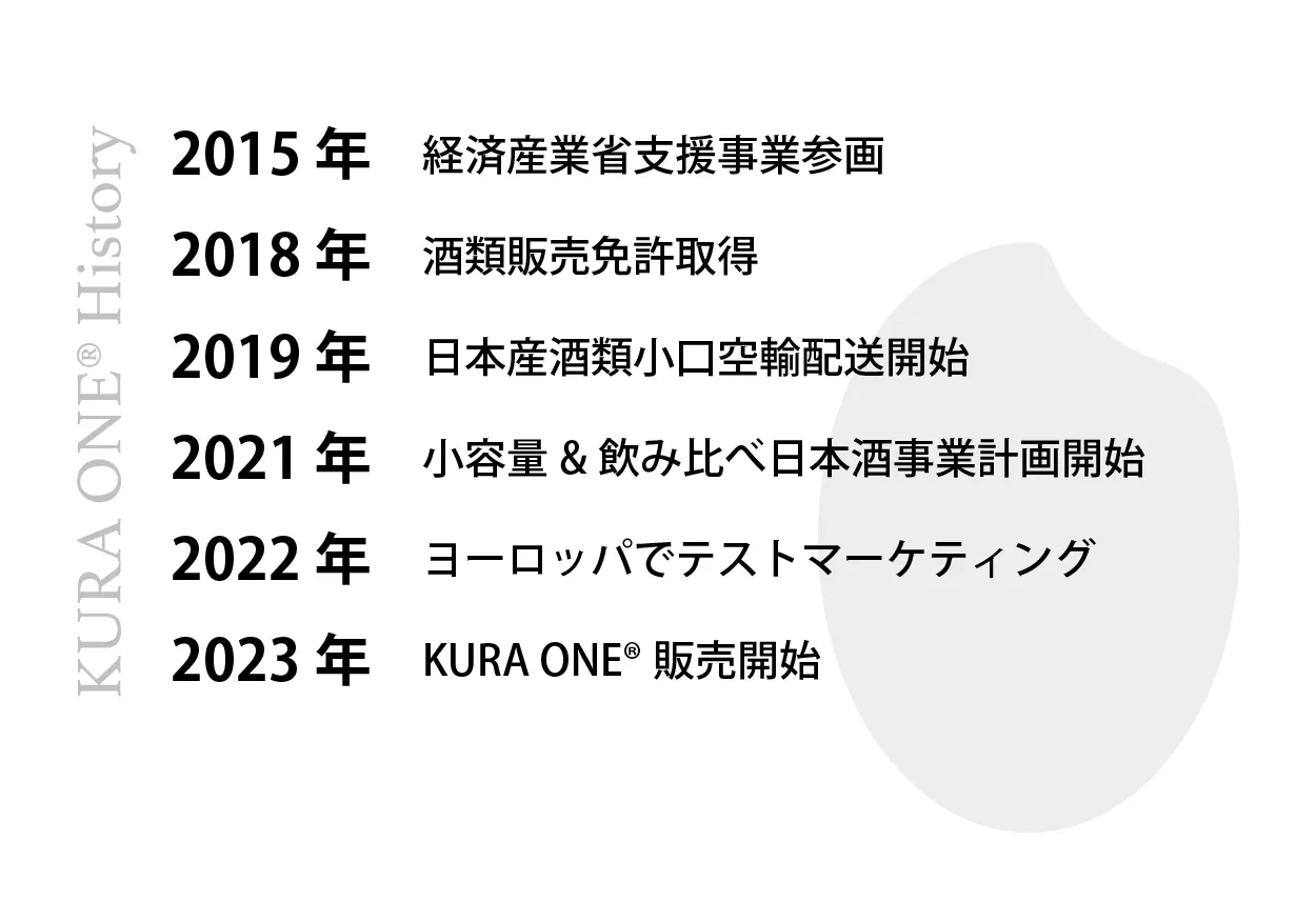 KURA ONE®は2021年に「小容量で飲み比べする中で日本酒の個性を見つけていく」ことを目的に起案した事業案が基本となって生まれたサービスです。2022年にはヨーロッパ3カ国(フランス、ドイツ、北マケドニア)でテストマーケティングを実施し、2023年1月にオンライン販売を開始しました。