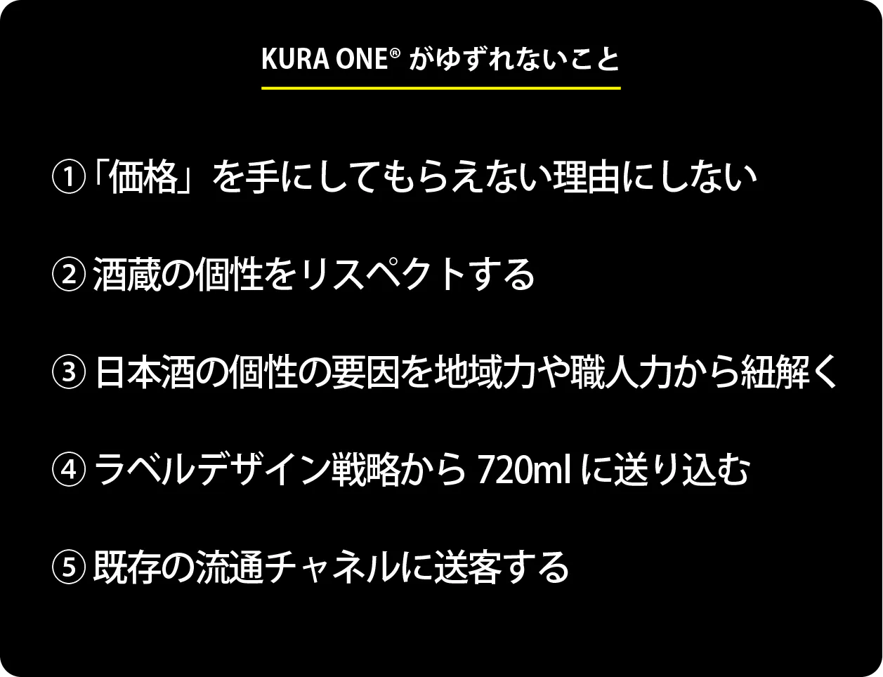 私たちは新しい挑戦をする際や課題にぶつかったとき、「KURA ONE®らしい対応か」「KURA ONE®として価値を提供できているか」「日本の地域の個性を届ける道筋は見えているか」「酒蔵の個性を際立たせることにつながっているか」を自問し、一つ一つを判断してきました。この判断の繰り返しの中で、KURA ONE®の理念が磨かれていると感じています。