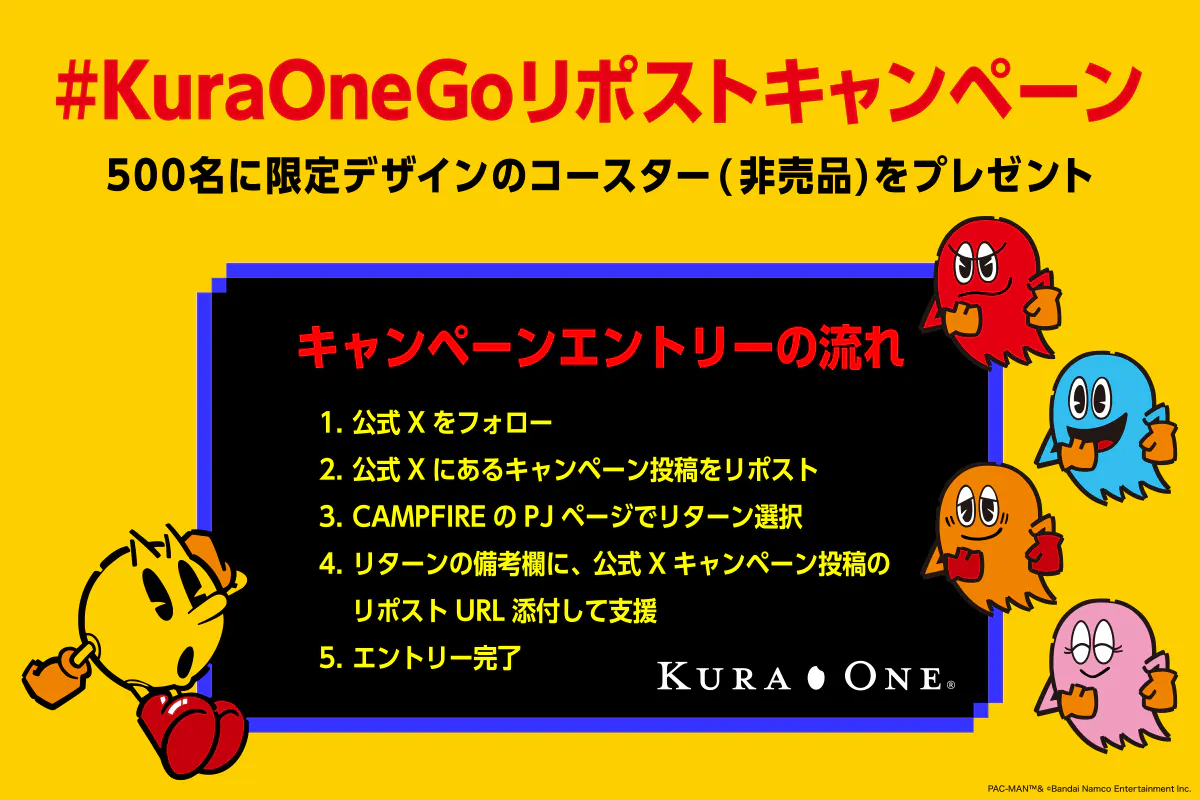 #KuraOneGoのキャンペーン投稿をリポストした支援者の中から抽選で500名様に「限定オリジナルコースター (非売品)」をプレゼントします。