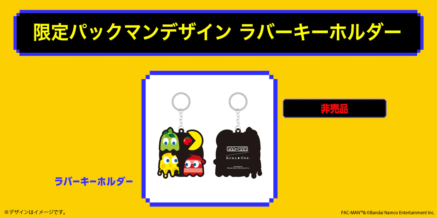 #KuraOneGo向けに特別にデザインされたパックマンとゴーストが連なるオリジナルのラバーキーホルダーです。