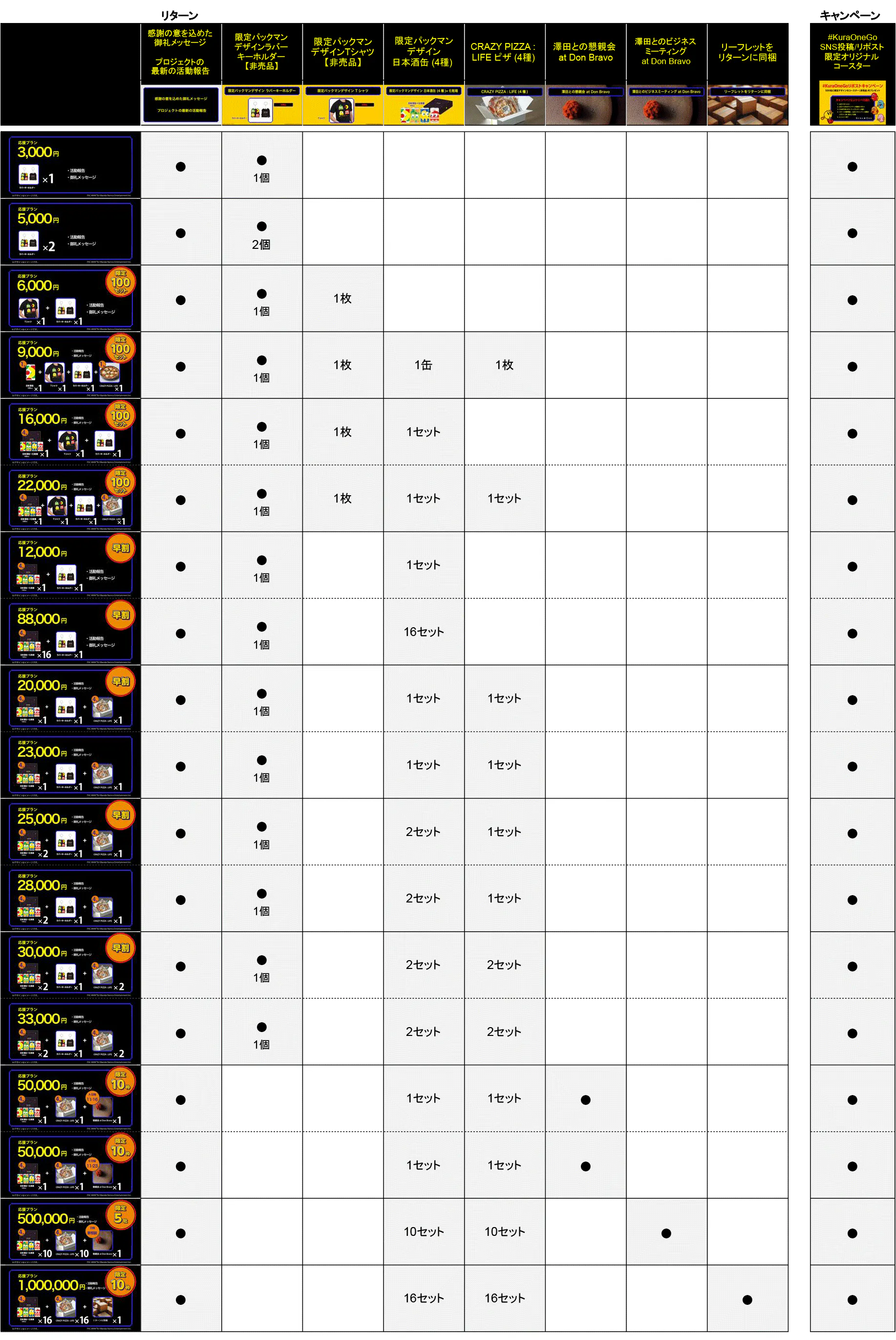 リターンと応援プランの一覧表は以下になります。PDFはこちらをクリックしてください。