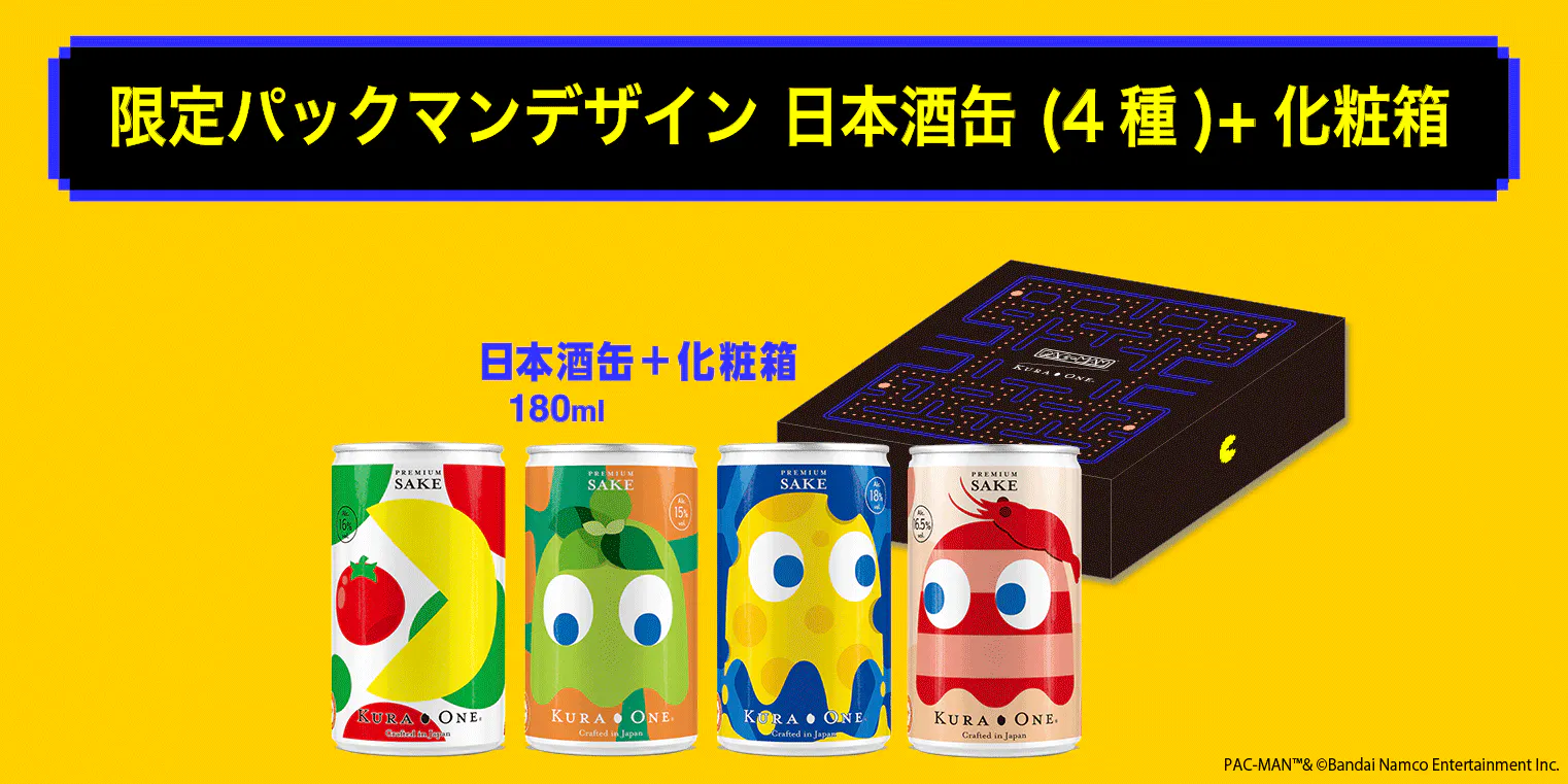 #KuraOneGo向けに特別にデザインされたパックマンとゴーストのパックマン日本酒缶 (180ml × 4缶) です。タイプ1では前述の日本酒が詰められています。タイプ2以降は活動報告でご連絡いたします。