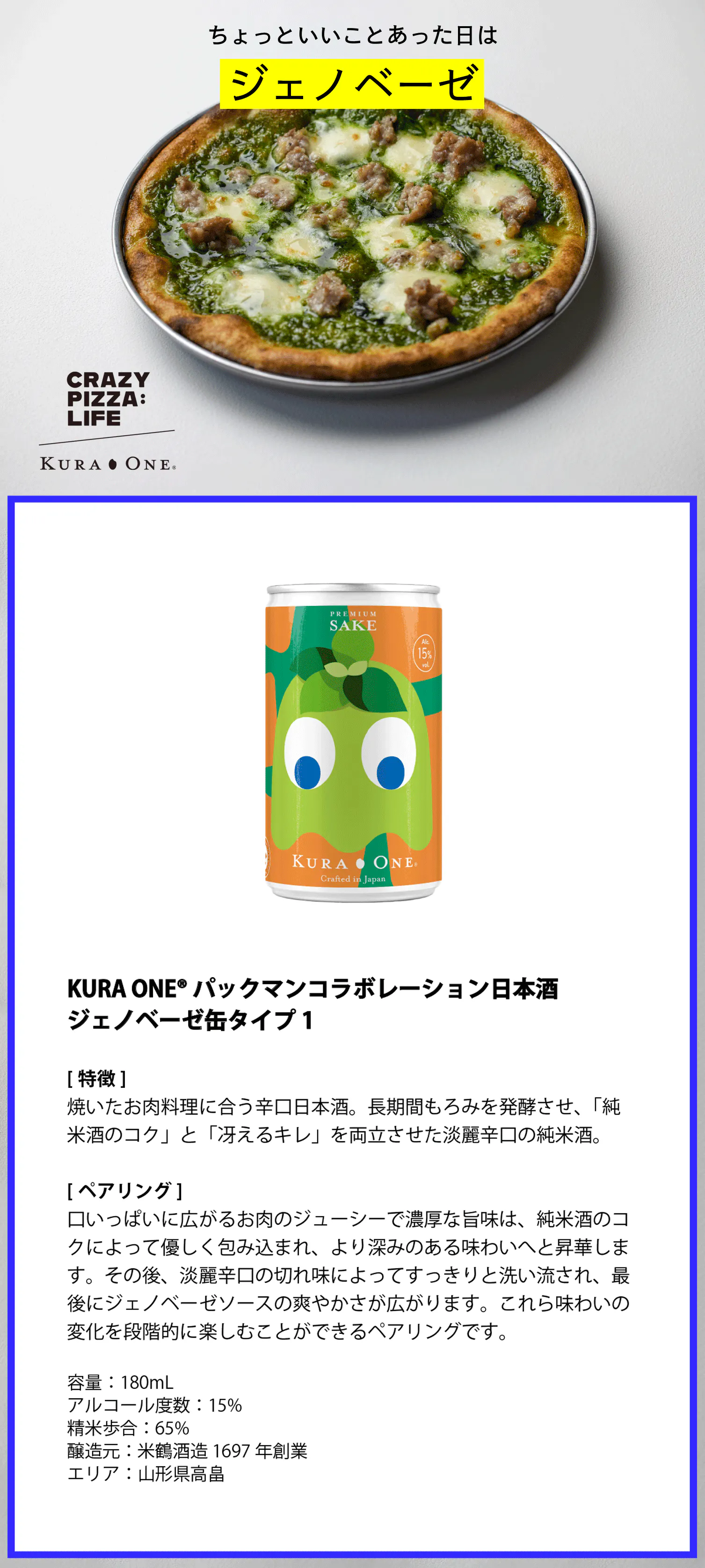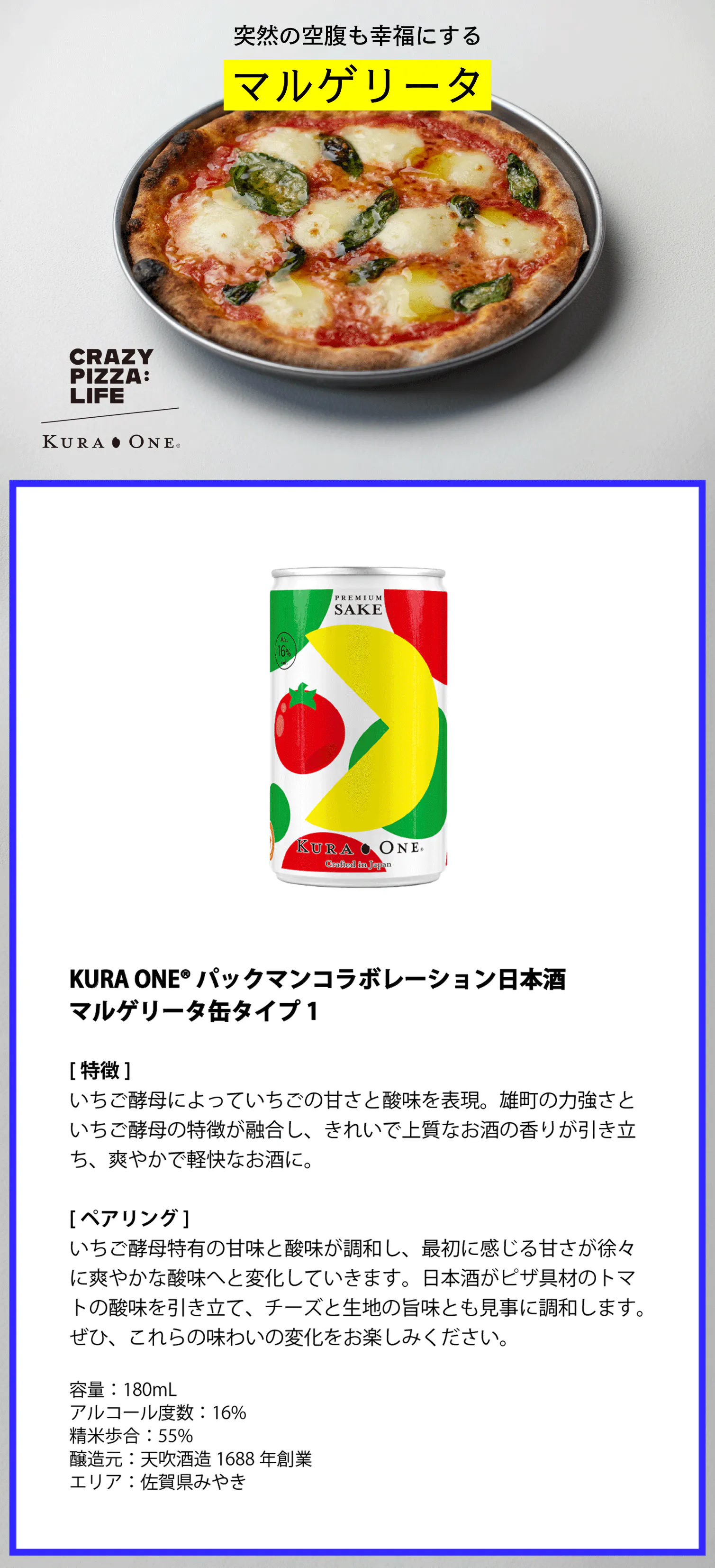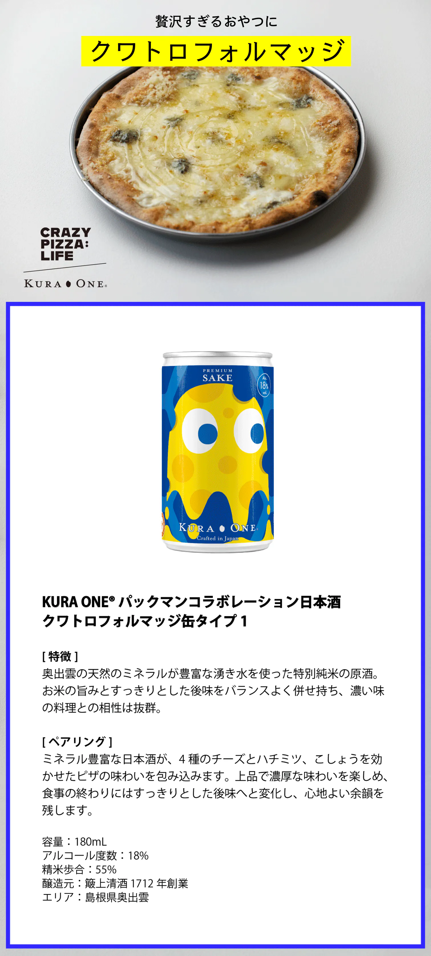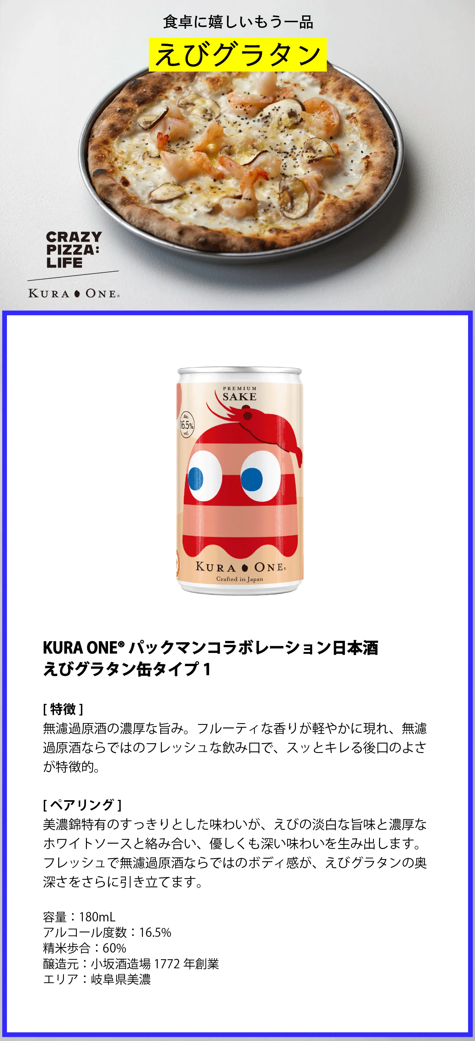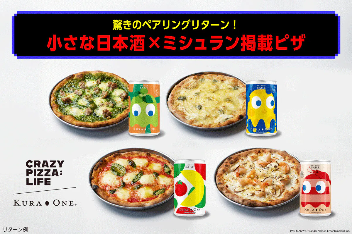 第二弾では、ゲームで大人気の「パックマン」とKURA ONE®の夢のコラボレーションデザインの日本酒アルミ缶を発表します。そしてミシュラン東京に掲載された話題の「CRAZY PIZZA:LIFE」とタイアップし「日本酒×ピザ」の異色のペアリングで新しい美食の発見をお届けします。