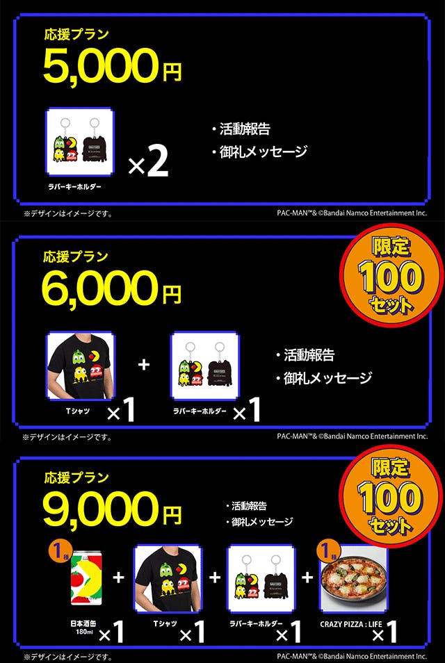 ・日本酒缶やピザはなく、Tシャツやラバーキーホルダーといった非売品アイテムを希望する方へのリターンです。