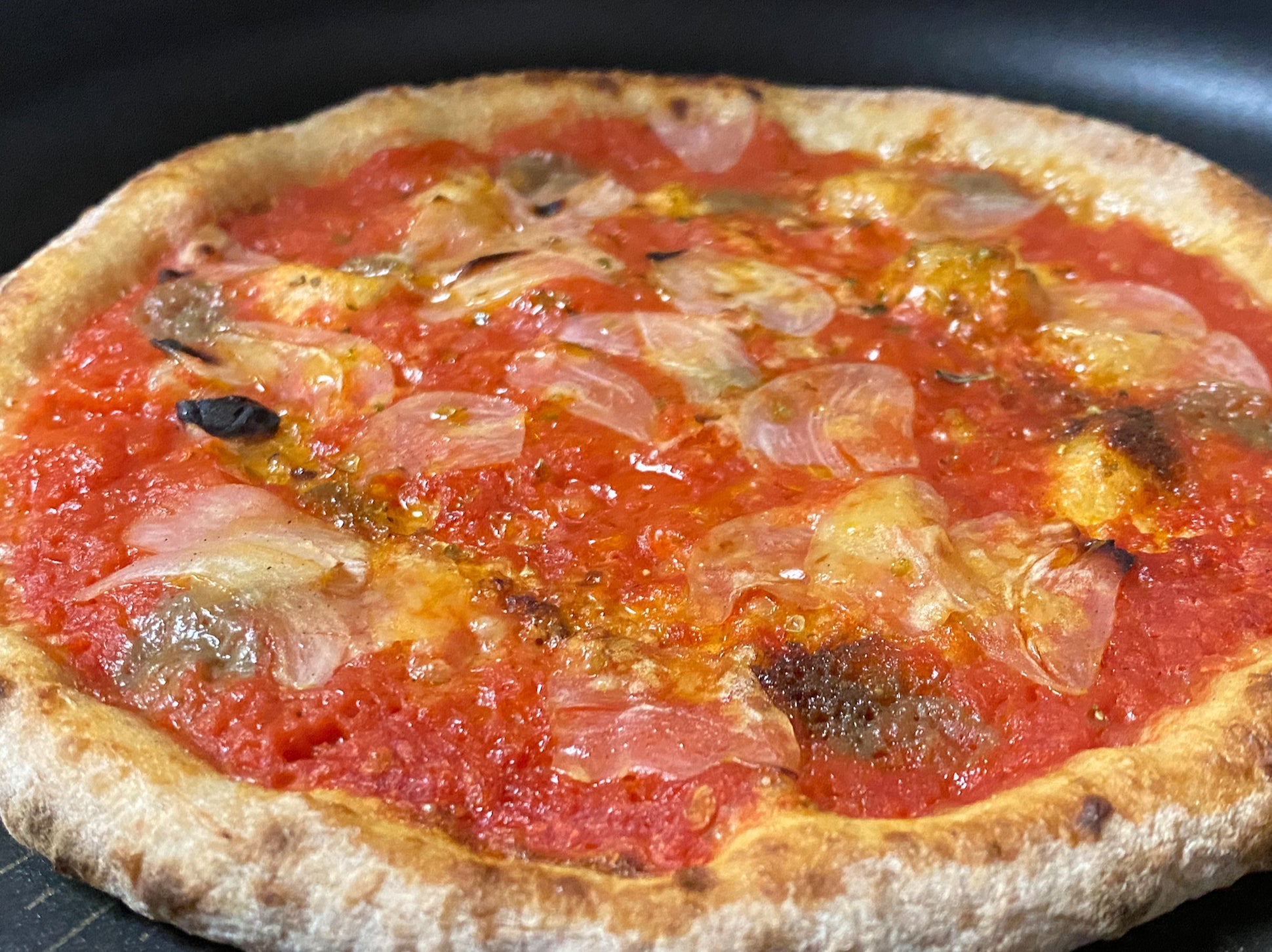 このマリナーラを一口、パンチが効いてます!トマトの酸味がグワッと広がり、そこにガーリックの香りが鼻を抜けていきます。チーズがないのに、こんなに存在感があるなんて!