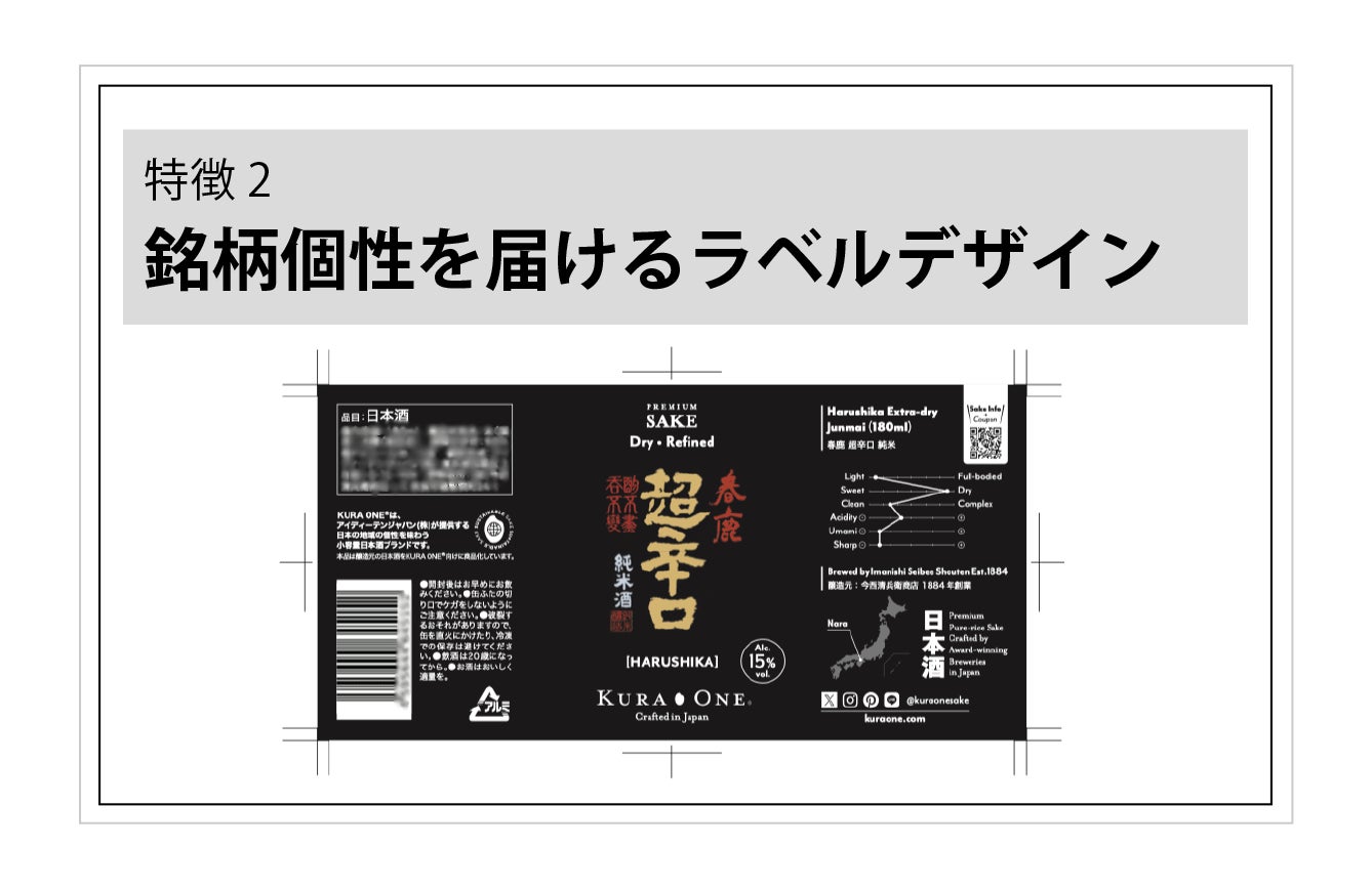 アルミ缶には、従来の醸造元のラベルデザイン要素を取り入れつつ、銘柄名をローマ字で表記し、味わいワードや味わいチャートを表示することで、分かりやすくに努めています。また、醸造元の場所を示した日本地図や創業年を伝えることで、酒蔵の記憶に残るようにしています。KURA ONE®は酒蔵と消費者の壁を払拭するオリジナルラベルデザインを採用しています。