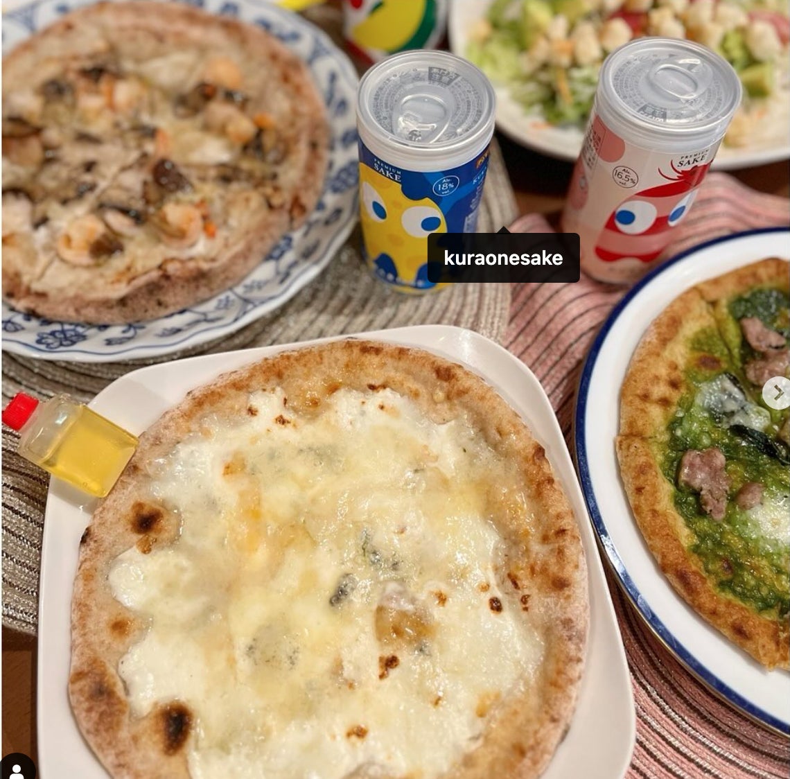 色とりどりの具材が踊る本格ピザが、食欲をそそります。マルゲリータの鮮やかな赤、クアトロフォルマッジの黄金色、ジェノベーゼの緑、えびのやさしいピンク。そして、その傍らに並ぶ遊び心満載のパックマン限定ラベルデザインの日本酒缶!