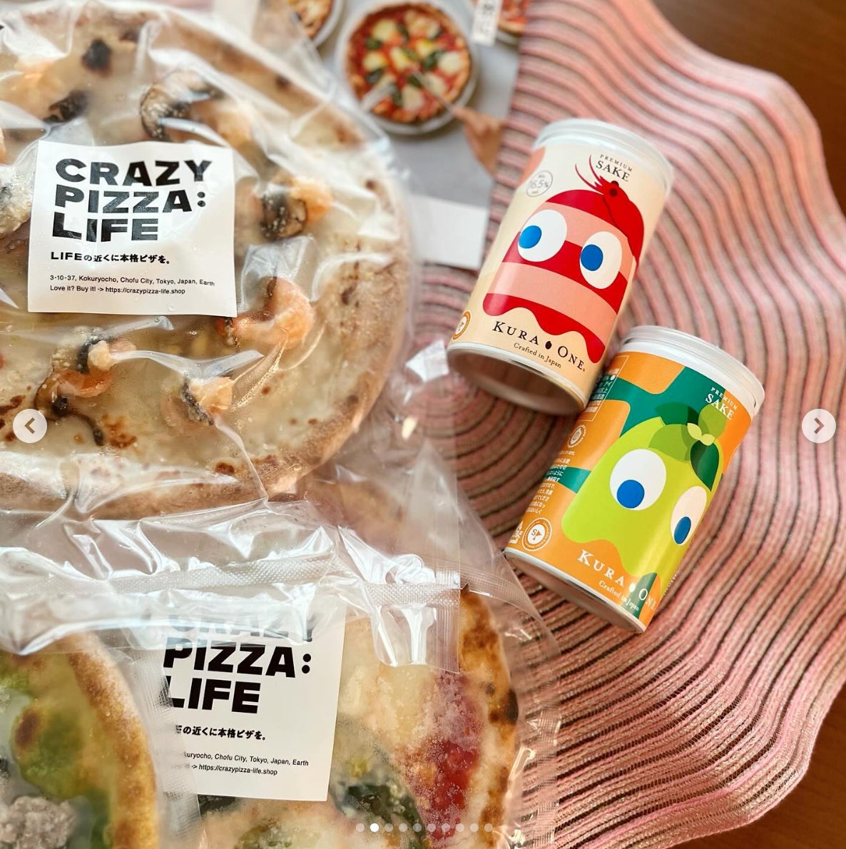 多彩な具材のピザに、個性的なパックマン限定ラベルデザインの日本酒缶がテーブルにあると、その場の雰囲気もパッと明るくなりますね。