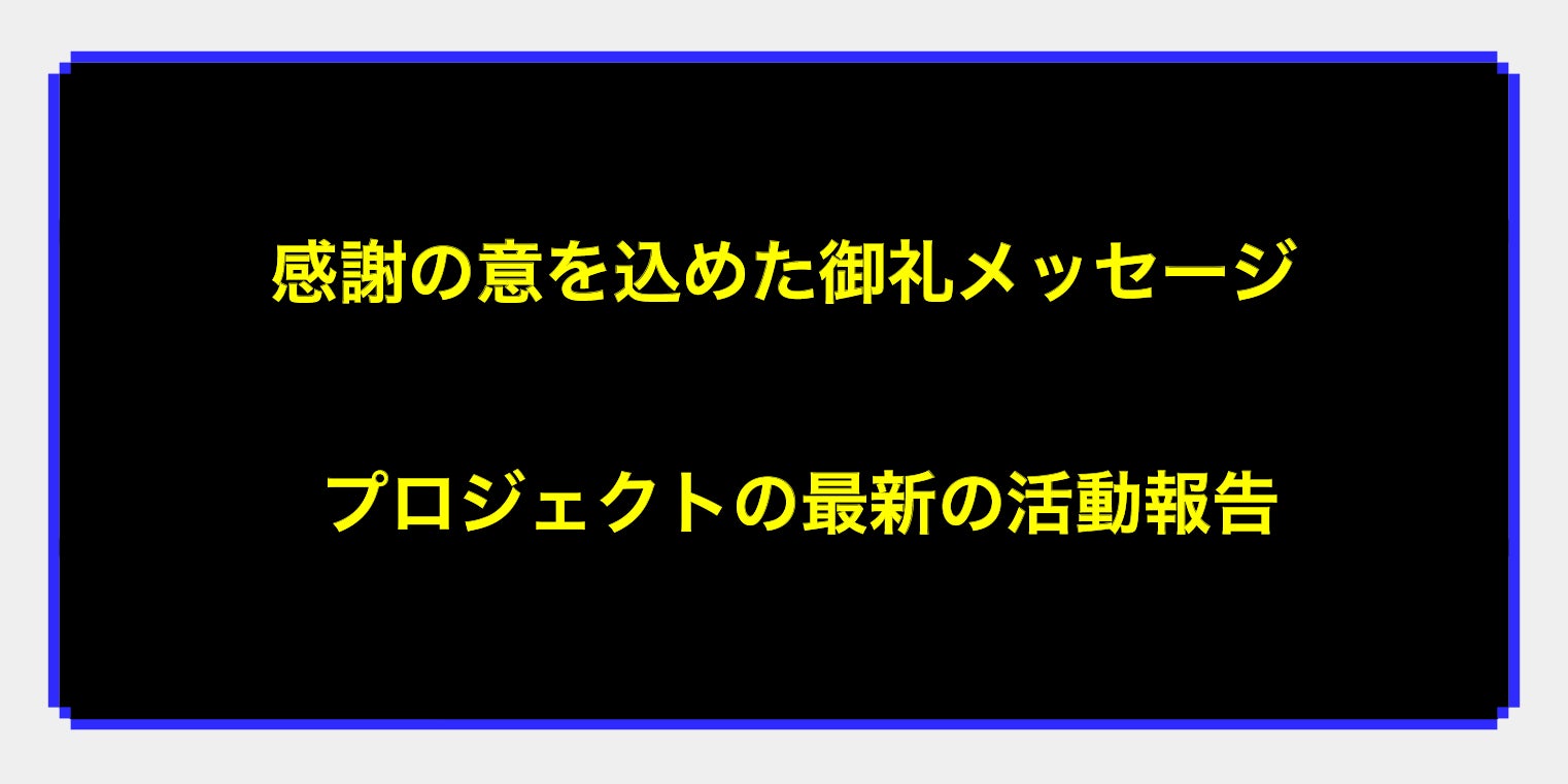 私から、CAMPFIREメッセージを通じて感謝の意を込めた御礼メッセージをお届けします。 またプロジェクトの最新の活動報告を、不定期で限定公開メッセージとしてお届けします。