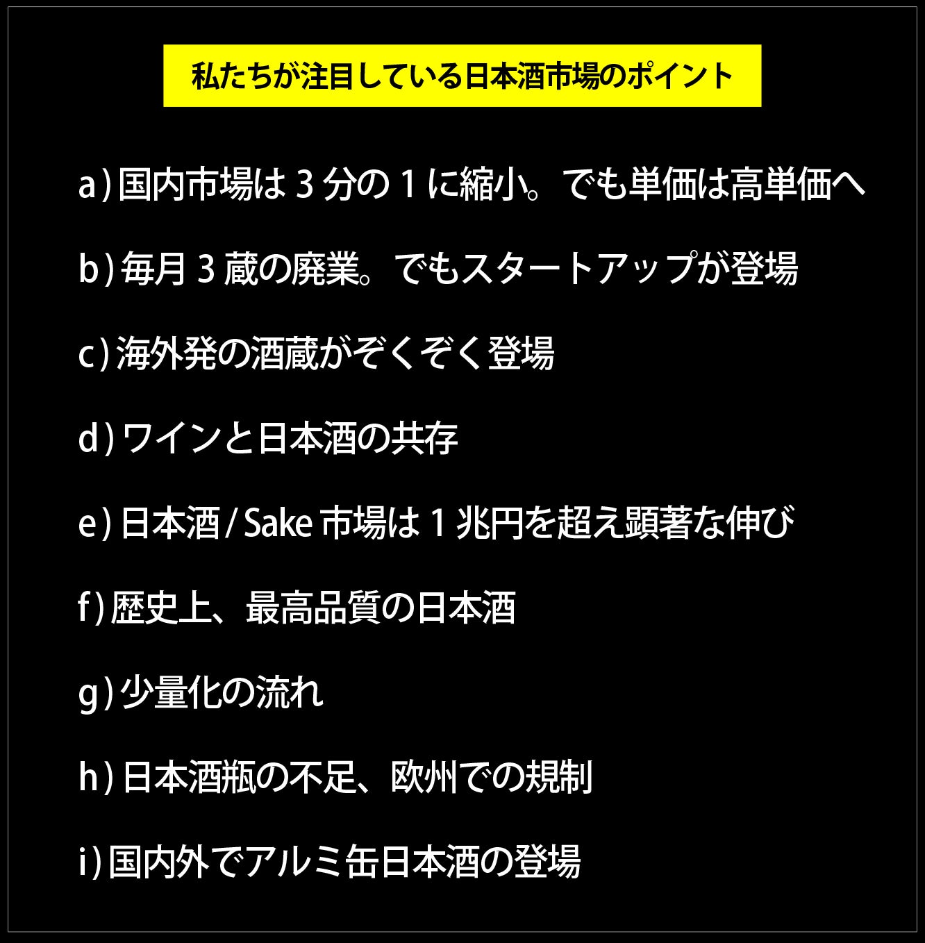 私たちは地域の個性を味わうをコンセプトにした小容量日本酒缶「KURA ONE®」を日本酒業界にぶつけて、市場からの反応、そして業界からの反応をつぶさにみてきました。中でも次のことがこの事業の推進を考えるために重要なキーファクターと考えています。