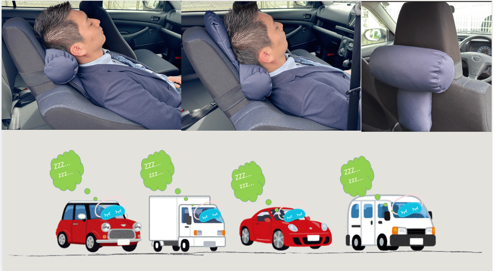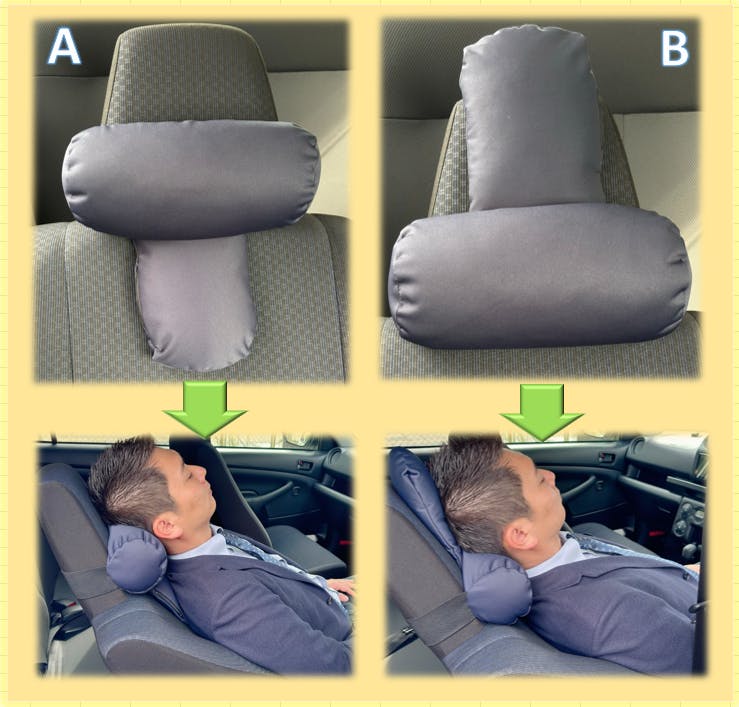 車内で仮眠でき、丁度良い取付ができるMobile Pillow をつくりました。