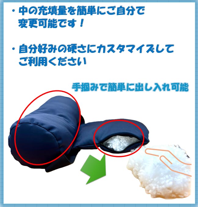 A:手掴みで簡単に出し入れ可能です。ファスナーを開け、少しずつの量を補填もしくは抜く方がスムーズに出し入れ可能です。補填用の綿も付属でご用意しております。
