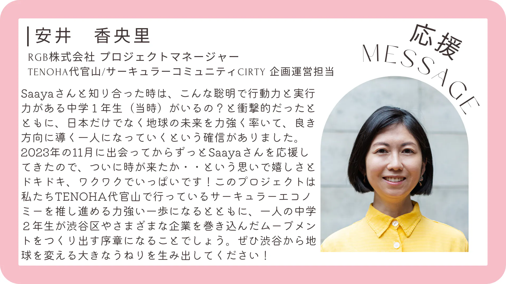 2025/10/02 20:24みなさま こんばんはお久しぶりです。ながらく活動報告ができておらず申し訳ありませんでした。実は渋谷区が行っているサステナブルアワード「渋谷サステナブルアワード2025」にて、優秀賞を受賞させていただきました。先日表彰式があり、Yuiと参加してきました。また、HPやインタビュー様子等公開されたら、ご紹介できればと思います。このような素敵な賞をいただきとても嬉しいです。これをまた1つのきっかけにより多くの人に届いたり、知ってもらえたりしたらいいなと思います。今後とも応援していただければと思います。よろしくお願いします。Saaya・Yui もっと見る