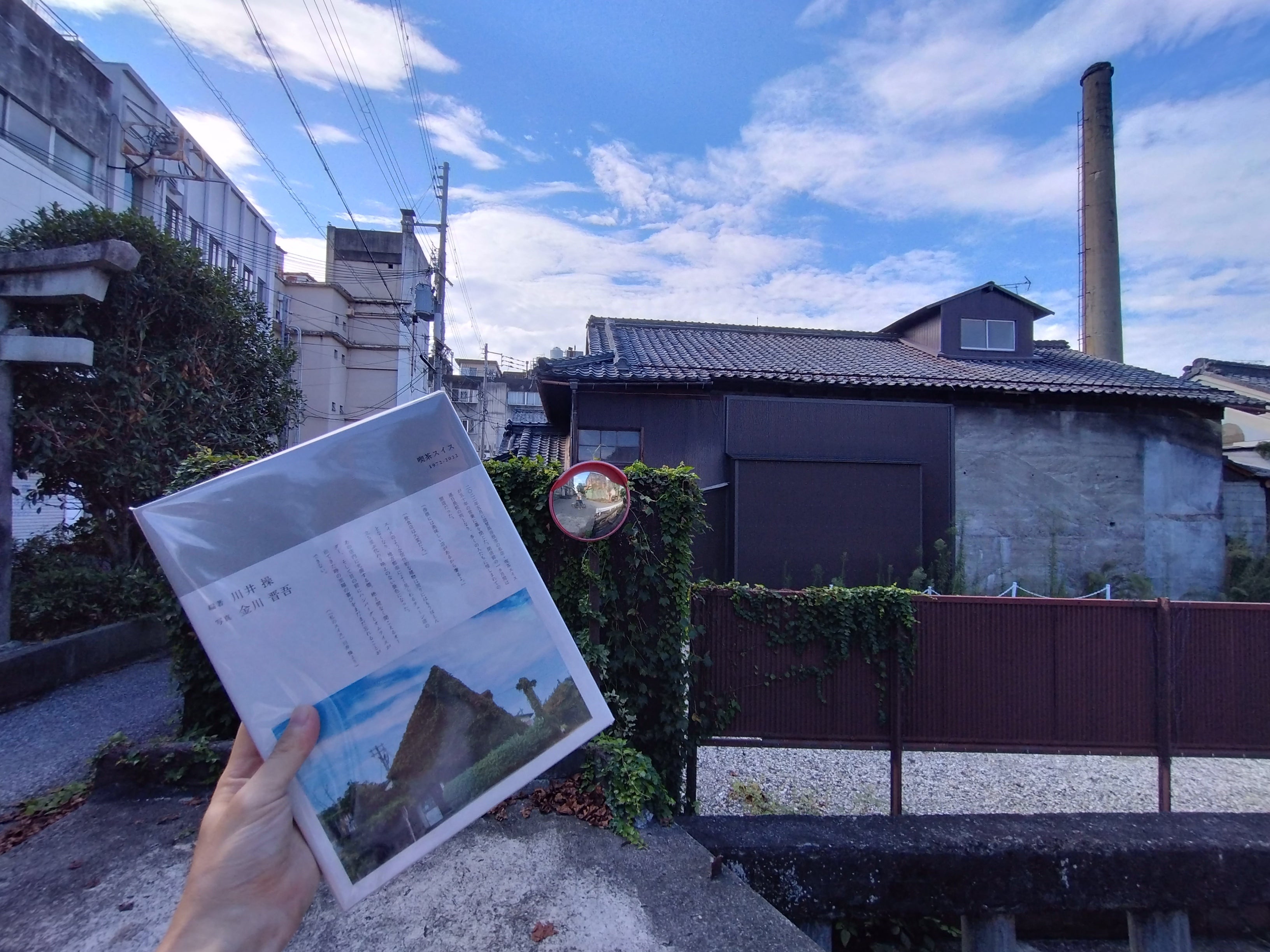 ▼『喫茶スイス1972-2022』をゲットした古本屋「半月舎」のある「山の湯」をバックに。(「山の湯」が銭湯として閉店しても解体されず古本屋とレコード屋として再生されているのは私にとって救いのストーリー。)