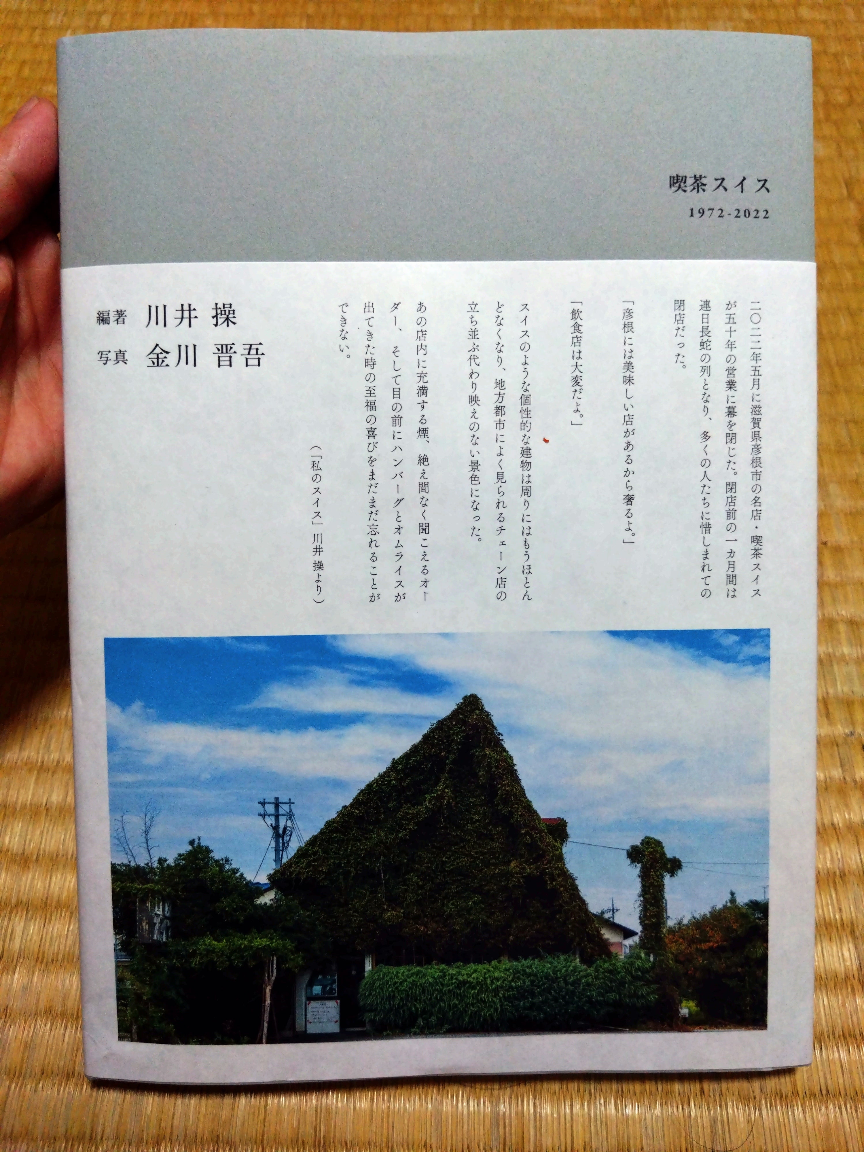 もともとよそもの(長浜市出身)の私ですが、20年前から彦根に住んで、この喫茶スイスにも時折行きました。周りのみんなが知っている、地元からも観光客からも老若男女問わず誰からも愛されリピートされる、確かに名店でした。何よりもその飛び抜けて目立ってユニークな蔦に覆われた三角屋根の外観が彦根市街地大通り「ベルロード」に面して車からでも目に留まらないわけがなく、彦根城方面から来ると芹川に架かる池洲橋からの下り坂の途中にあって自転車だと勢いのついている頃なのですがブレーキをかけて止まりたいレストランだということが(自転車でしか来れない学生さんたちがよく来られたという文脈で)本文中のオーナーご夫妻へのインタビューの中でも触れられています。寄稿文で描かれているスイスの中の雰囲気やメニューなどについては、もうあのにおいが漂ってくるかのようでした。たしかにこうやって写真とともに本にしていただいたことで、今はもう跡形もなくなってしまった「喫茶スイス」に再開することが出来、貴重な回顧録・写真集だと思いました。