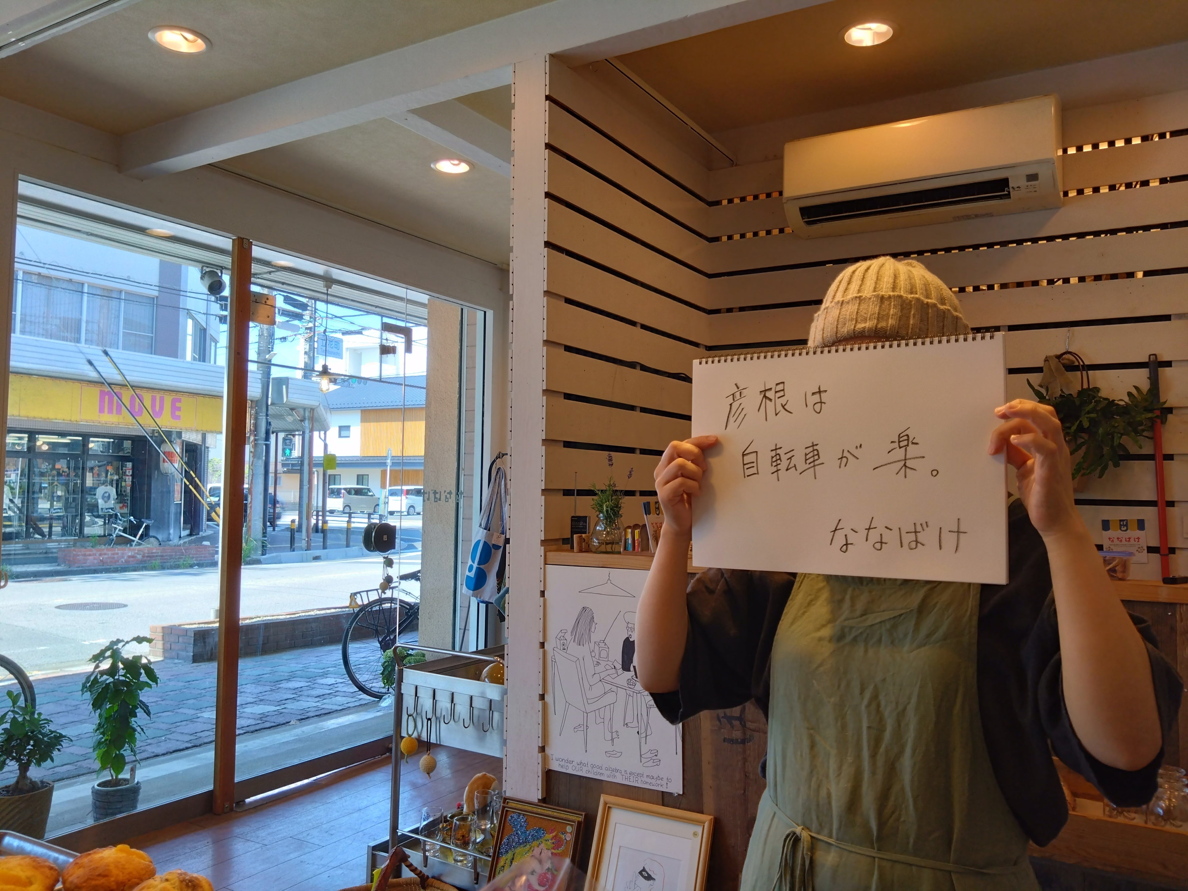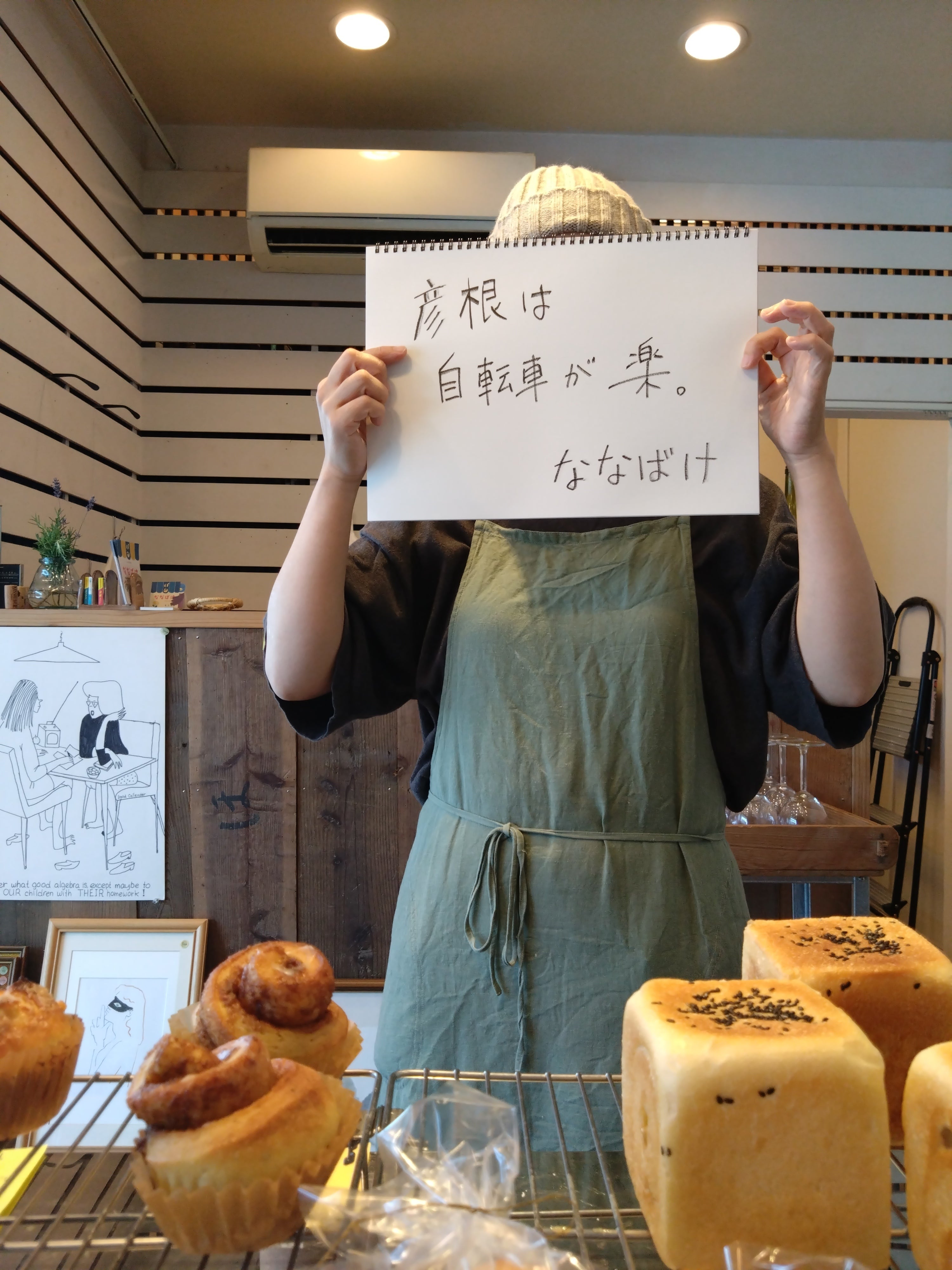 今回のクラファン、プロジェクト側としては初めてだったため、五環生活の会員さん(Biwako Backroads松井さん)の紹介でキュレーター(Mediart植田さん)を立てています。植田さんによるクラファン説明会当時のおススメで、地域の支援いただいている方から応援メッセージを集めるといいよ~とのことだったので、この期になってではありますが、集め始めています。その第一号が写真の中央商店街のパン屋「ななばけ」さんによる「彦根は自転車が楽。」です。