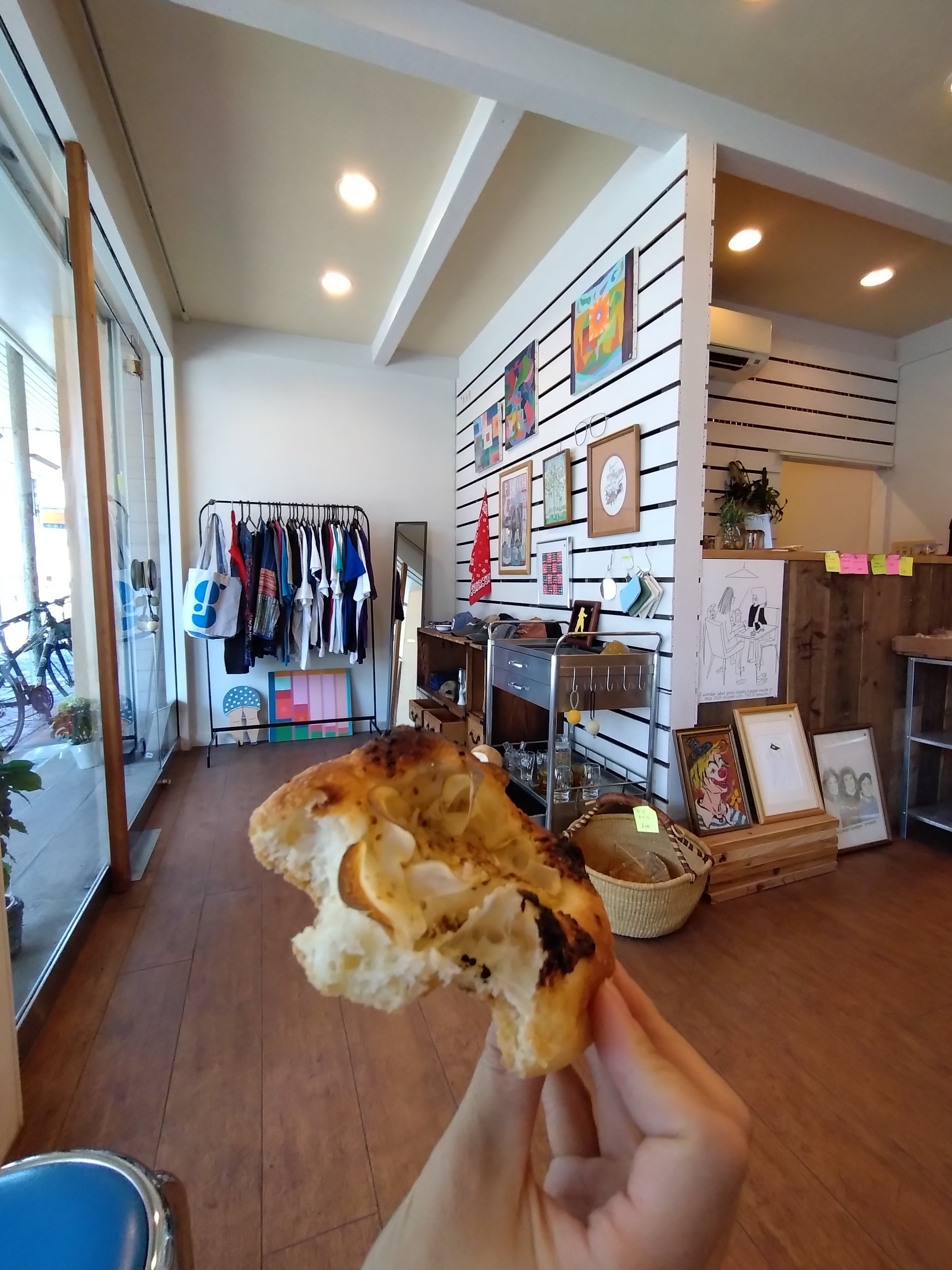 と、いう話から始まり、会話は弾みました。私が、実はななばけさんを市内で自転車で行き交っているのをよく見かけるというと、市内を車で移動するのが煩雑だと思っていて、なので自転車の方が楽と思ってますと。出店でパンを運ぶ時もそんなに遠くなければカゴや荷台のバックに詰めて運ばれるそうです。ななばけさんのパンは生地が味わい深く嚙みしめられるので好きですが、パンをあの自転車(なかなか年季の入ったいいかんじの自転車です)で運ばれるところをイメージするとまた好感度が増してしまい美味しさもアップしました。