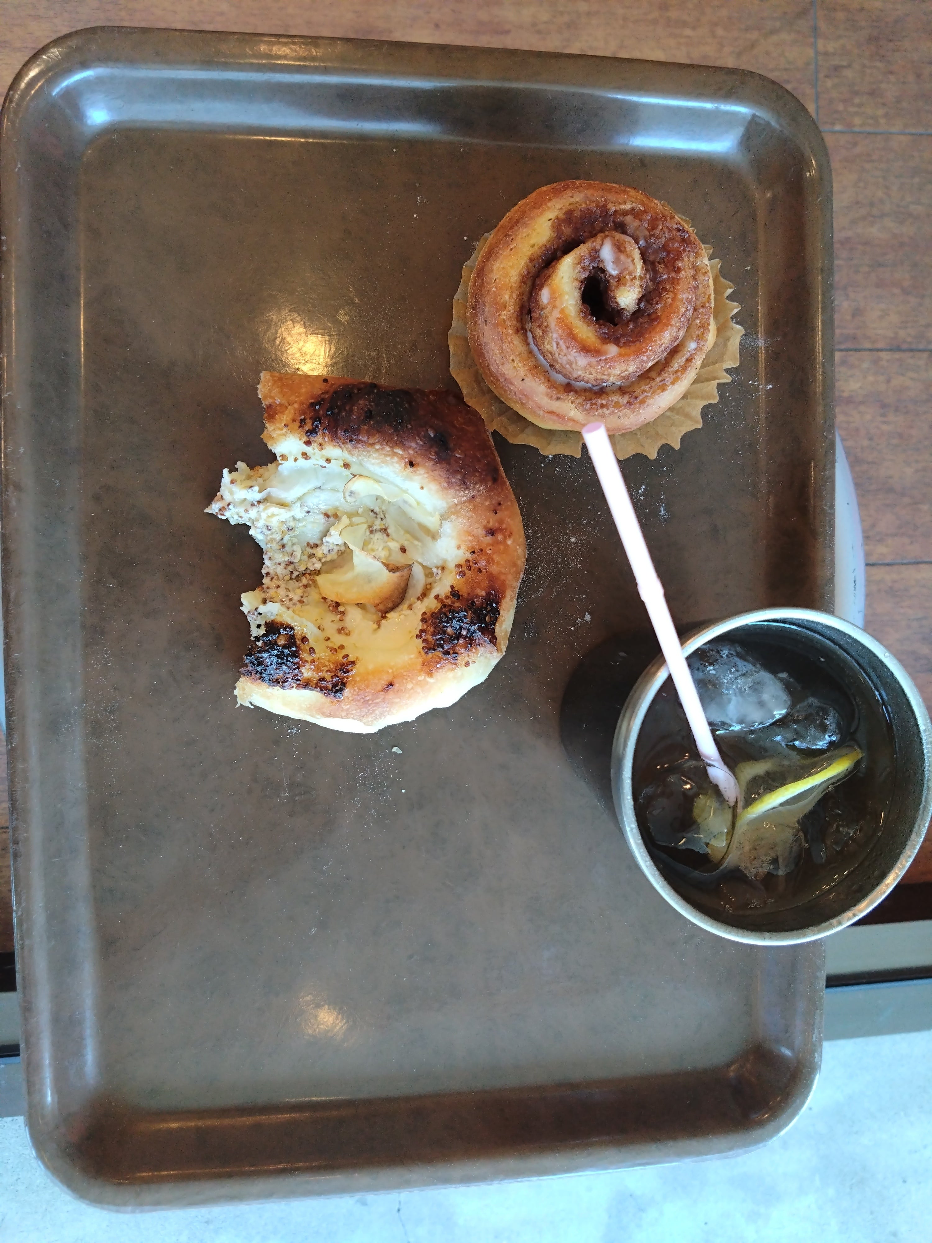 ③フォカッチャ(食べさしですが)、シナモンロール、しょうがはちみつ(シナモンの風味にレモンの輪切りも入れてもらってサイダー割り!おいしい!)