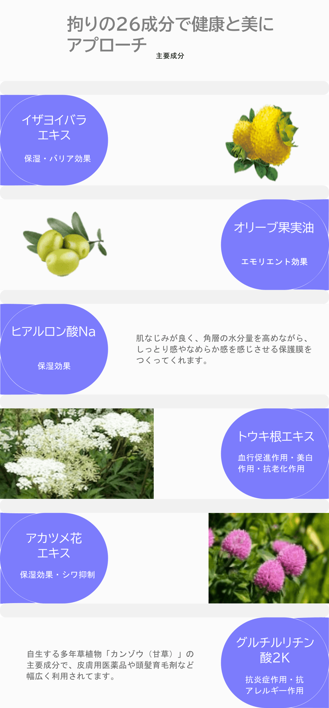 ●イザヨイバラエキス、アカツメクサ花エキス、トウキ根エキス、オリーブ果実油を配合