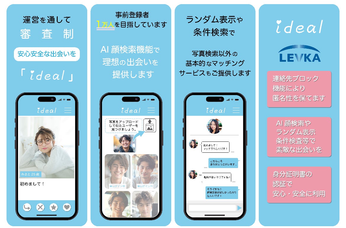 2024/12/03 19:47はじめまして!株式会社LEVKAです。現在マッチングアプリを開発しておりますが、我社のマッチングアプリは従来のものとは違った機能が搭載されています。AIを搭載した”顔マッチング”です!好みの顔写真をアプリにアップロードすると、ユーザーの中から似た人を抽出して好みの顔のユーザーとマッチングできる機能です。芸能人や友達の写真等の人物だと認識できる写真であれば何でもOKです♩ここで大事なのが、本人だと認識されるユーザーはヒットしないように設定されています。その為匿名性を保てます。他にも、・日付検索・条件検索(身長や年齢、職業)・趣味検索・目的検索(自分と同じ目的のユーザー)・AI顔検索といった機能が搭載されており自分に合ったユーザーを見つけることができます。リリースを楽しみにしていてください♩ もっと見る