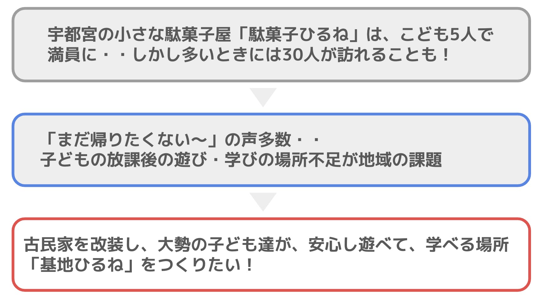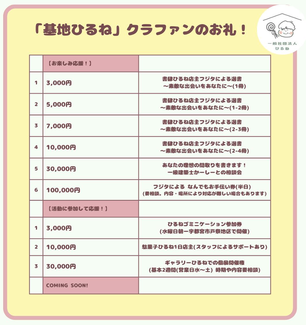 • 【ご支援くださった皆さまへ ご報告です!】昨年は、CAMPFIREでのクラウドファンディングを通じて「基地ひるね」立ち上げにたくさんのご支援・応援をいただき、本当にありがとうございました。皆さまの後押しを受けて動き出した「基地ひるね」プロジェクトが、このたび、栃木県主催の「輝く“とちぎ”づくり表彰」優秀賞を受賞いたしました!!11月7日付の下野新聞に掲載されました。電子版リンク:https://smart.shimotsuke.co.jp/articles/-/1225204(県の発表はこちら:https://www.pref.tochigi.lg.jp/c01/houdou/251030hyosyo.html)この賞は、地域課題の解決に向けて社会貢献活動を行う県内の団体をたたえるもので、皆さまにご支援いただいた活動が評価されての受賞となりました。「こういう活動が地域にとって大切だよね」と認めてもらえたことをとても嬉しく思っています。何より、あの時クラファンで支えてくださった皆さまのおかげです。心から感謝いたします。今後も、次の展開に向けて地に足をつけて新しい挑戦を始めています。引き続き温かく見守っていただけたら嬉しいです。これからもよろしくお願いいたします。基地ひるね クラファン チーム一同【ひるね情報】・〒320-0057 栃木県宇都宮市中戸祭1-5-4 ・Mail: info@hirune.or.jp 一般社団法人ひるね(担当:池田)・公式HP:https://hirune.or.jp/  ※駐車場情報HP下に掲載あり。Instagram:・イベント案内など (@hirune.dagasi)・書肆ひるね(新刊本・喫茶)(@hirune.books)・基地ひるね(もんじ・駄菓子屋、寺子屋)(@hirune.monji) ※書肆ひるね、基地ひるねは路地裏にある隣接した拠点です。 子どもも大人も楽しめます。 裏路地を探検するように遊びにきてください。 もっと見る