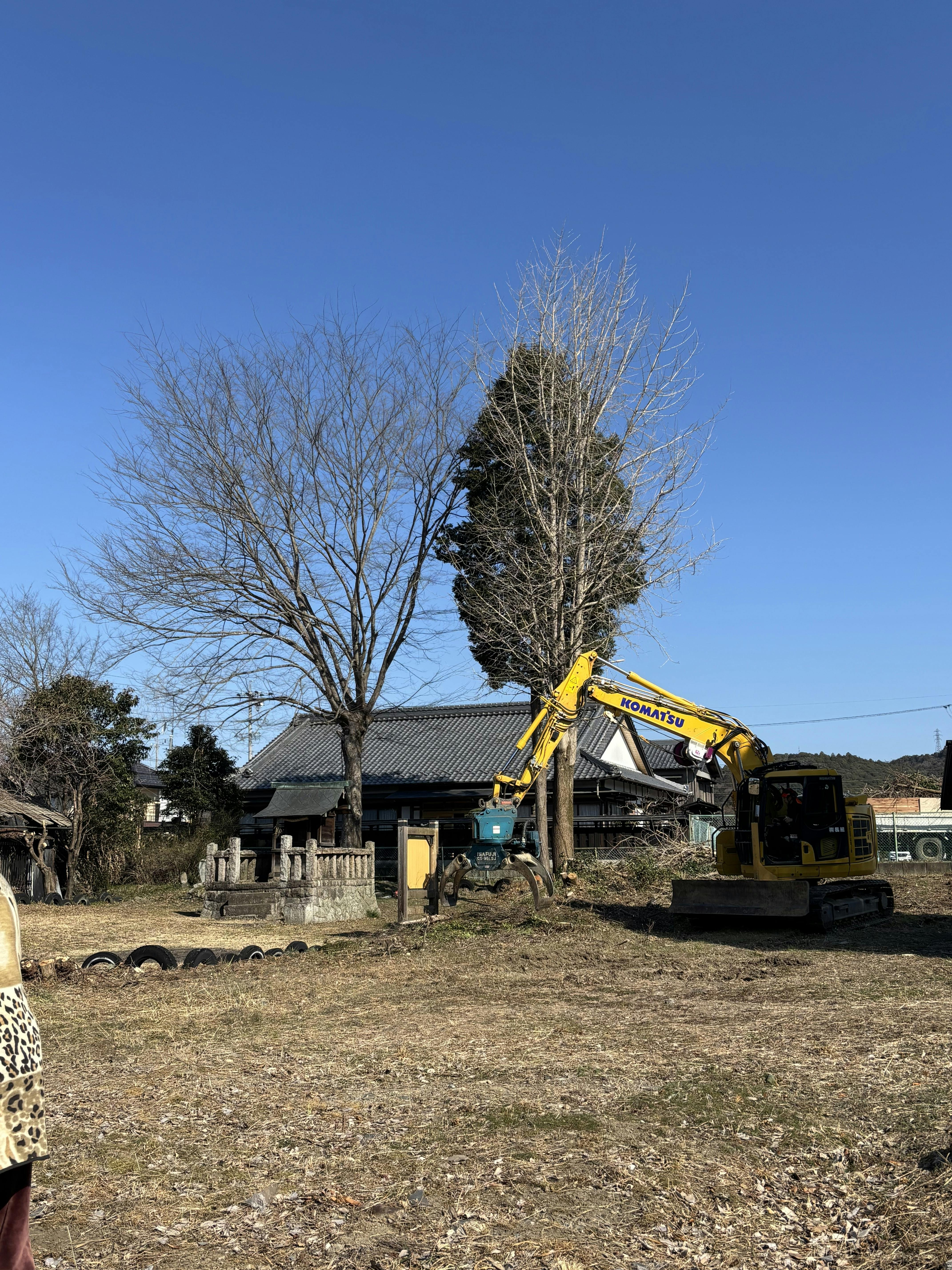 そして、3月10日は伐採業者の柘植林業様が大きな10トンのトラックやユンボなど持込みヒノキやイチョウを伐採。入り口の桜もご近所さんの屋根の上に乗ってしまっていたので整備ができました。