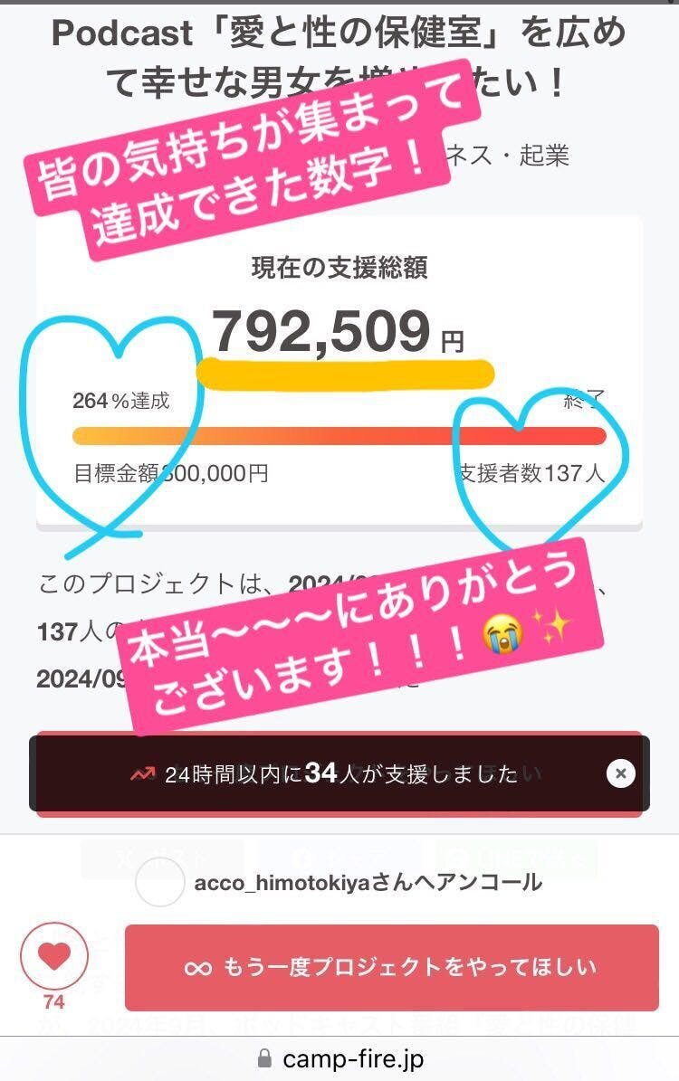 2024/10/01 14:36いつも応援ありがとうございます!愛と性のひもとき屋・松岡晶子です。9/30の23:59をもって…無事にクラファン終了しました~~~!!!!!!!!!!!ご支援くださった皆さま、拡散や人脈のご紹介という形でご協力いただいた皆さま、心の中でエールを送って下さった皆さま本当にありがとうございます。最終着地として支援者数 137名支援金額 792,509円達成率 264%いくら知り合いといっても皆が応援してくれるわけじゃない。必ずしも賛同して下さる方ばかりではない。そんな中で、この数字…本当に愛と感謝しかないです。皆さんの力でここまで来れました!たくさんの愛と感謝を送らせて下さい。本当にほんとうに…ありがとうございます(≧▽≦)♡個別でのお礼やリターンに関するご連絡など、改めて差し上げますね。取り急ぎ、お礼まで! もっと見る