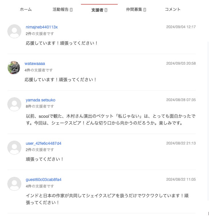 ご支援者様のお名前をご掲載いたします。(ニックネーム可、希望者のみ)