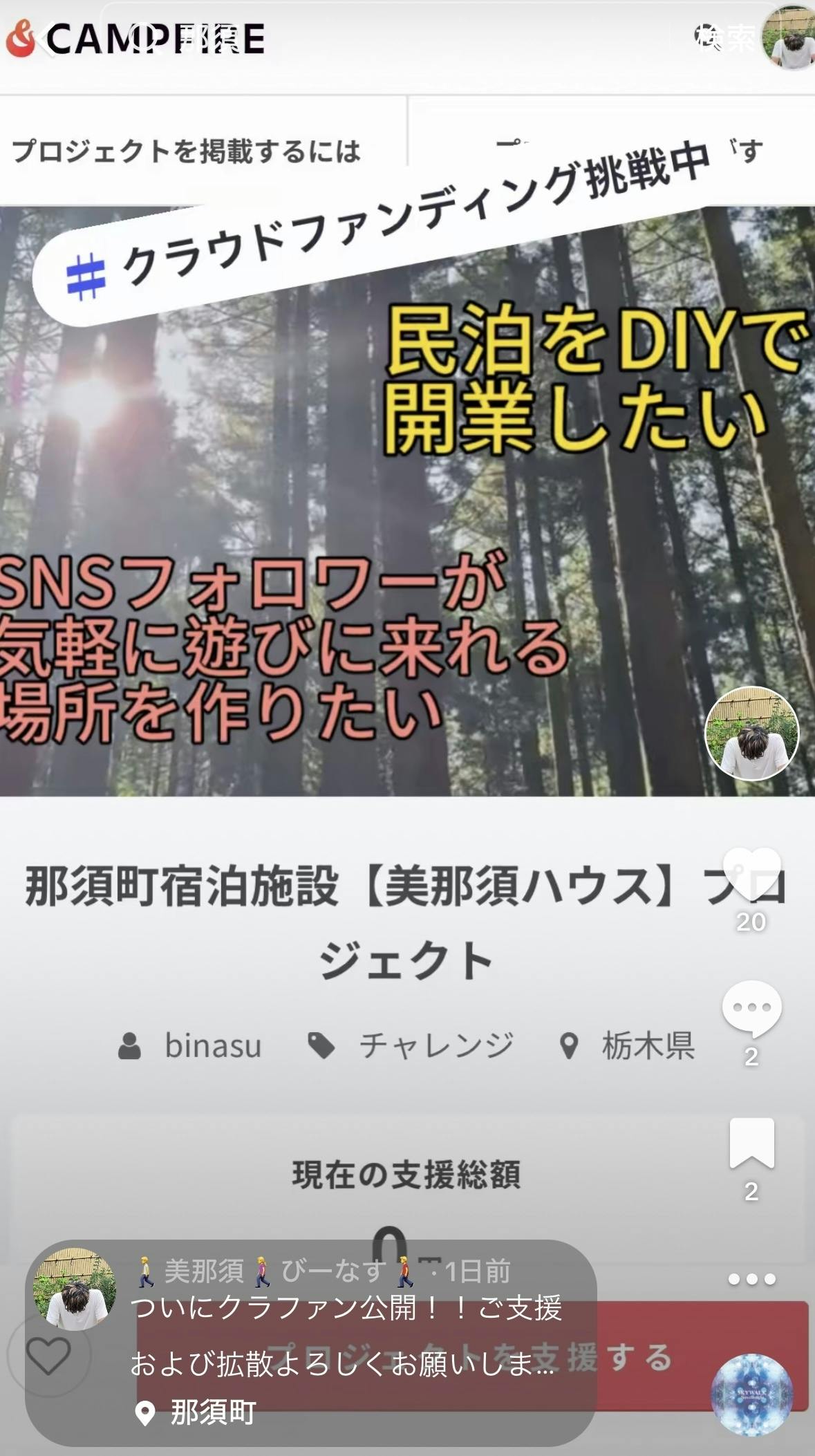 私が実現したいのは、SNSのフォロワーさん向けに那須町で特別な宿泊施設を作ることです。支援頂いた資金を元に格安物件をDIYで作り上げていく様子をTikTokライブをメインに発信していきたいです。完成した施設では、フォロワーの皆さんが直接那須の自然や文化を体験し、リラックスしながら交流できる場所を提供します。宿泊施設を通じて、より深いコミュニティを形成し、地元の魅力を広く伝えることが目標です。