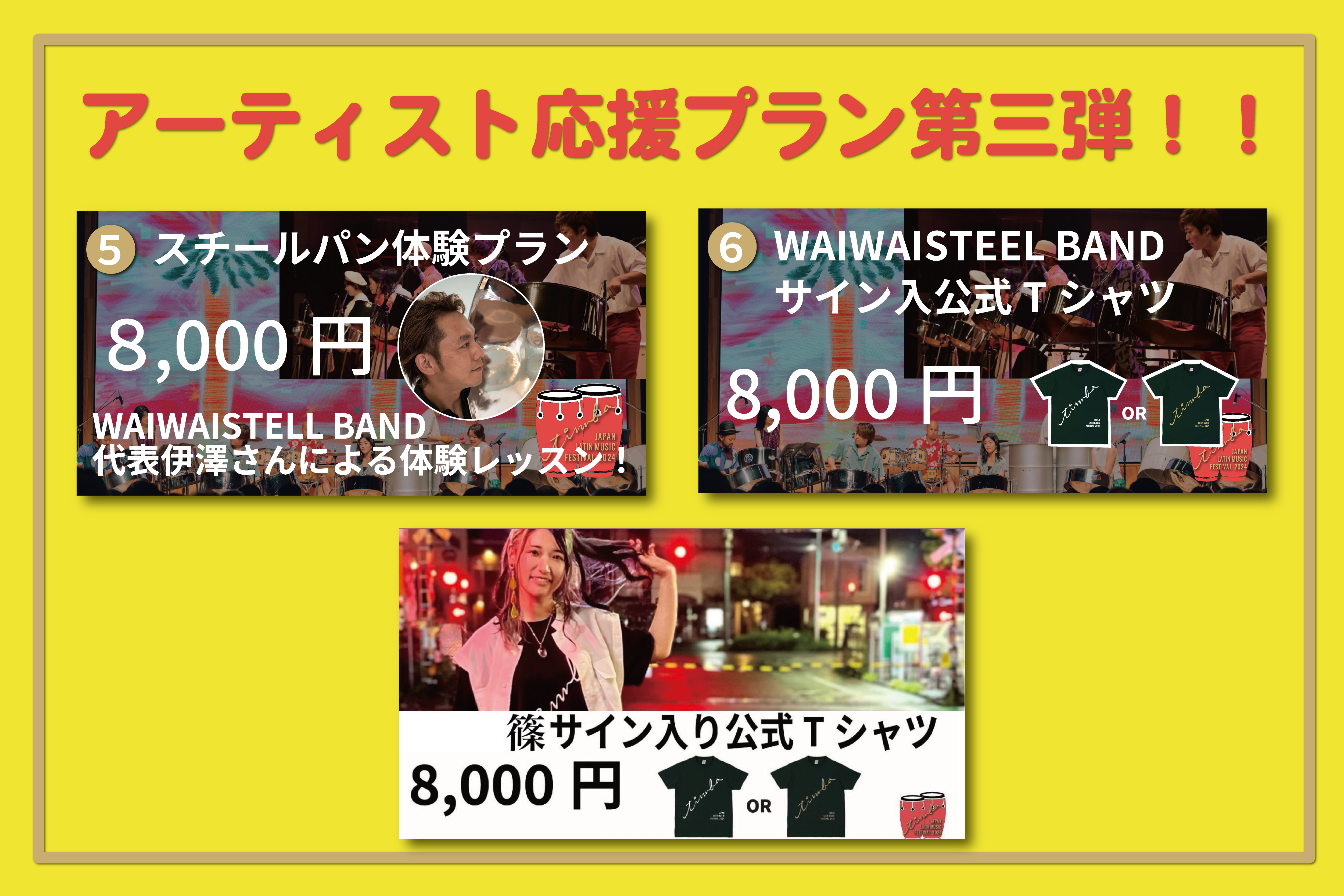 第三弾は日本を代表するスティールパンバンドWAIWAI STEEL BANDと公式Tシャツモデルを務めていただいているパーカショニスト篠奈々子さんから応援プランです。