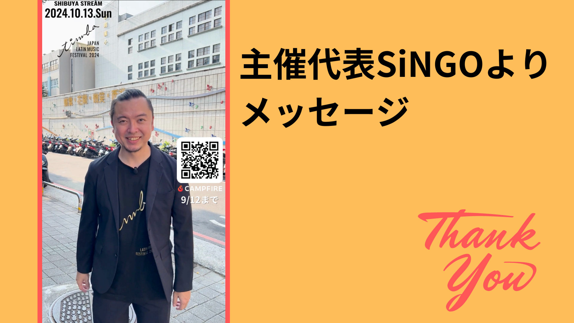 Hola feslatimbaスタッフです。いつも応援をありがとうございます!本日は、主催者SiNGOからのメッセージをお届けします。ぜひご覧ください▽https://youtu.be/fTCUE4K8kOIクラウドファンディング残すところ2週間。終了は9/12。渋谷ストリーム1Fに、みんながラテンを知ることができる無料エリアを増設したい、そんな夢に今年はチャレンジしています。ラテンを知ると何がいいのか。一番は明るく元気になれること!単純ですね(笑)でも、ラテン音楽を聞いていると、いつの間にか心にエネルギーが注入されることに気が付きます。少しずつでいいから日本を元気に活性化、私たちにできる最大のチャレンジです。ぜひ応援をよろしくお願いいたします!================feslatimbaでは、全てのリターン品に・公式HPへのお名前掲載・心を込めてお礼のメッセージをお送りしています。================ご支援はもちろんのこと、ハッシュタグ「#feslatimba」をつけてSNSでシェア拡散お願いします。▼ご支援いただく際のリンクはこちらhttps://camp-fire.jp/projects/view/779713▼Instagramhttps://www.instagram.com/feslatimba/▼X(旧Twitter)https://twitter.com/feslatimbaよろしくお願いいたします!
